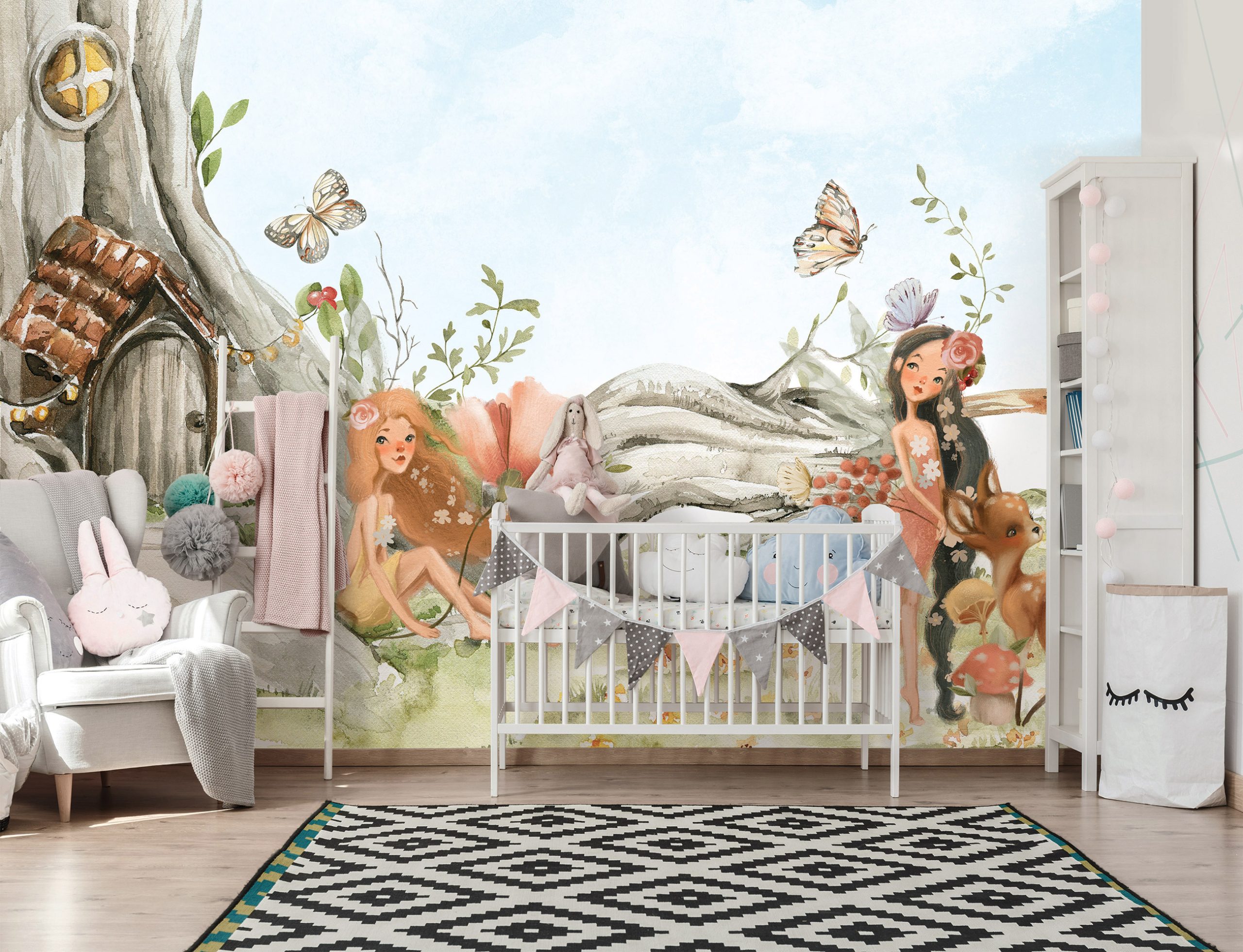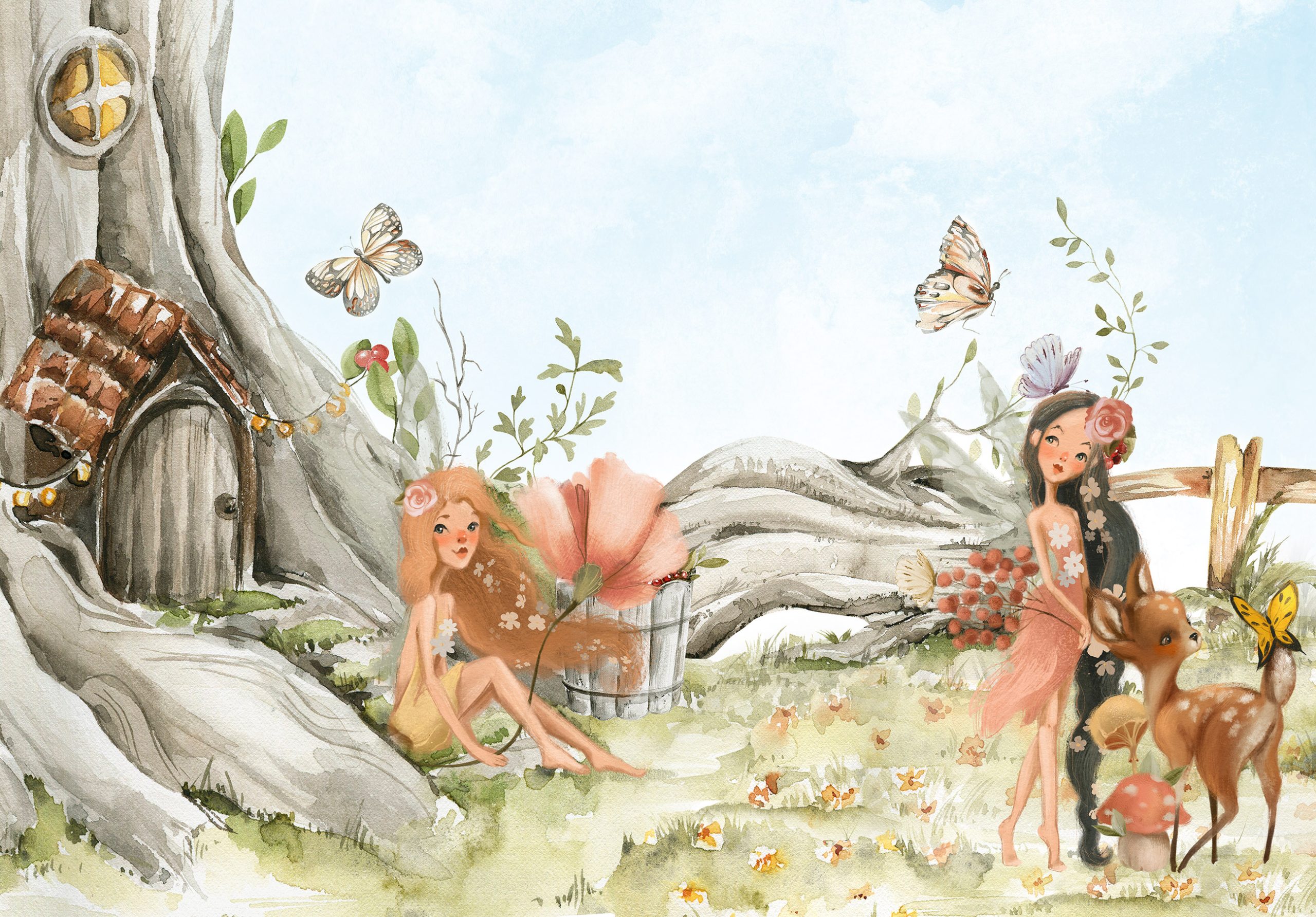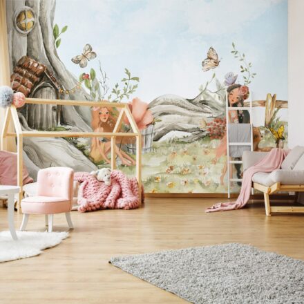Mesés játékokhoz nyújt hátteret a fotótapéta, melyen erdei tündérek és szelíd állatok képe rajzolódik ki.