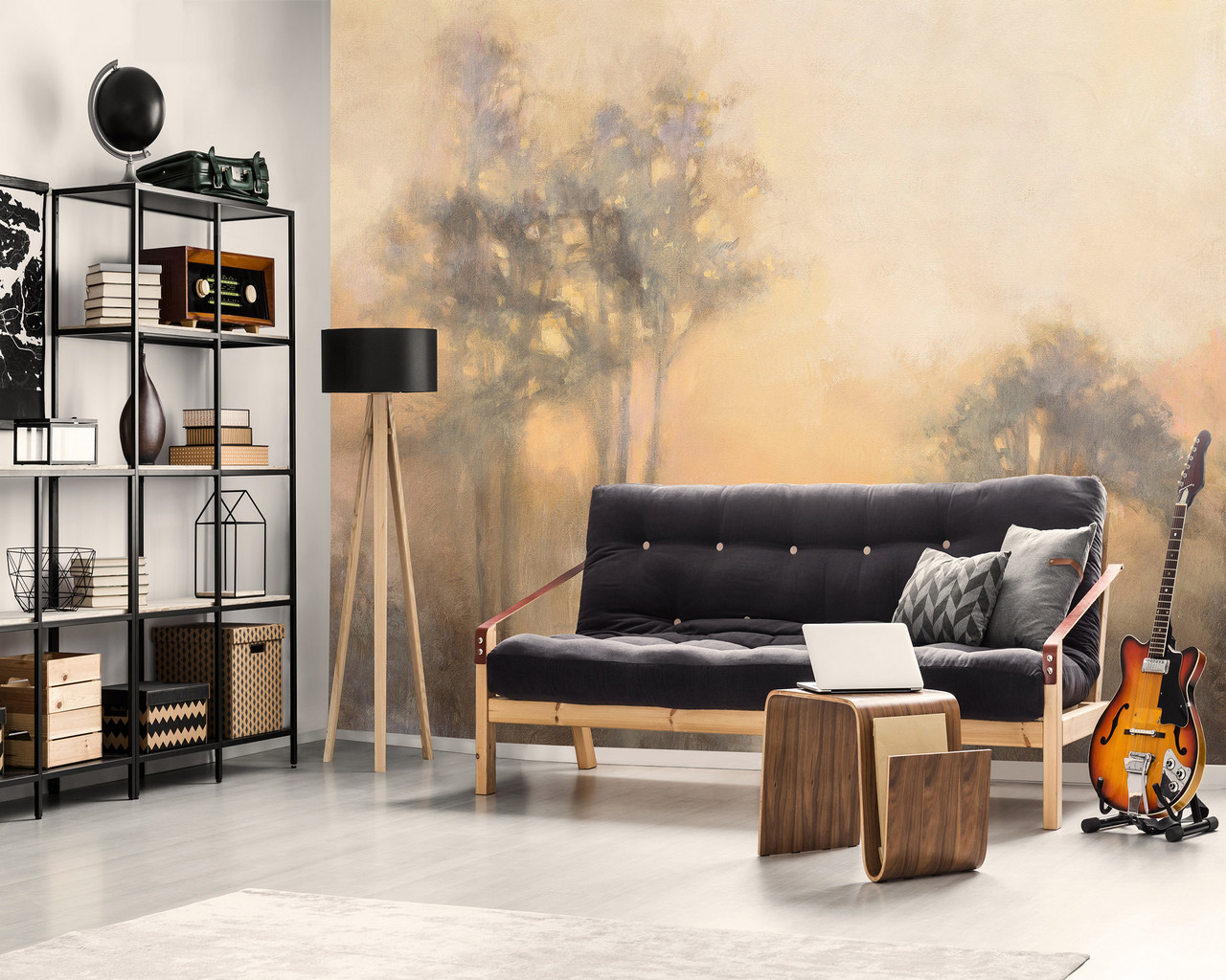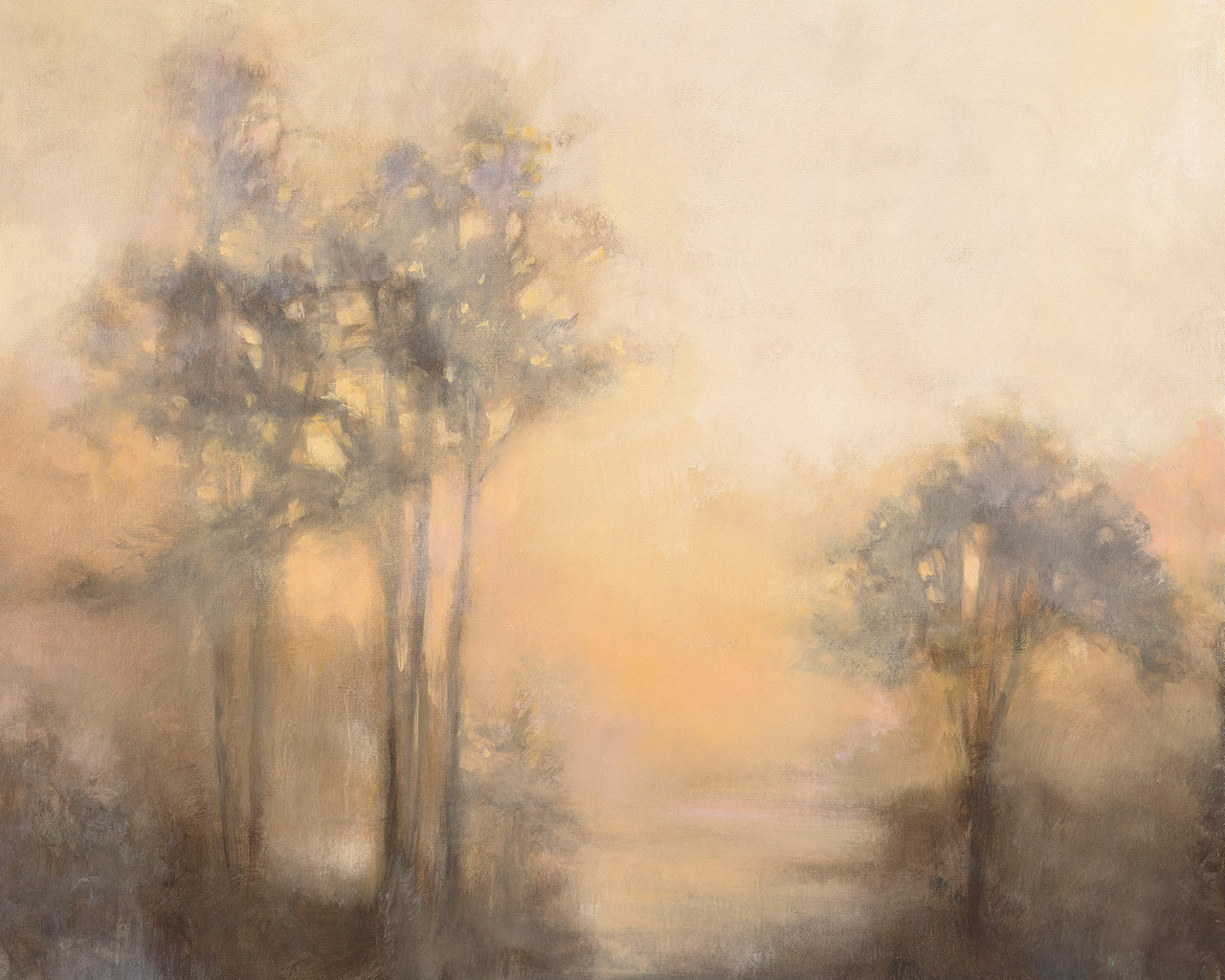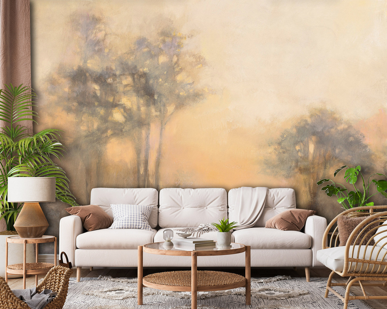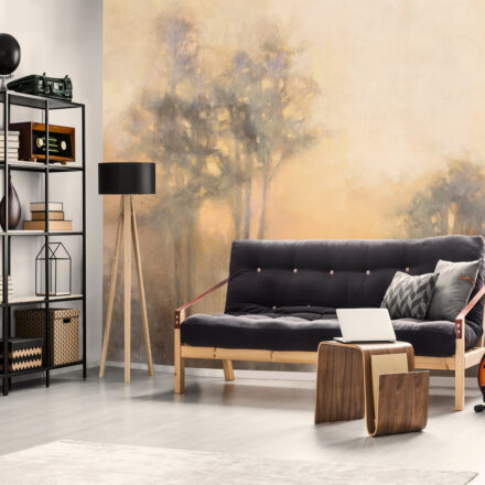 Fotótapéta hajnali tájképpel, ahol a fák lombjait a kelő nap fénye ragyogja be.