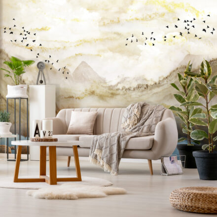 Hangulatos fotótapéta, melyen hegyvidékek között megbúvó tavat látunk. A harmonikus tájképnek csodás kiegészítését jelentik repülő madárcsapatok.