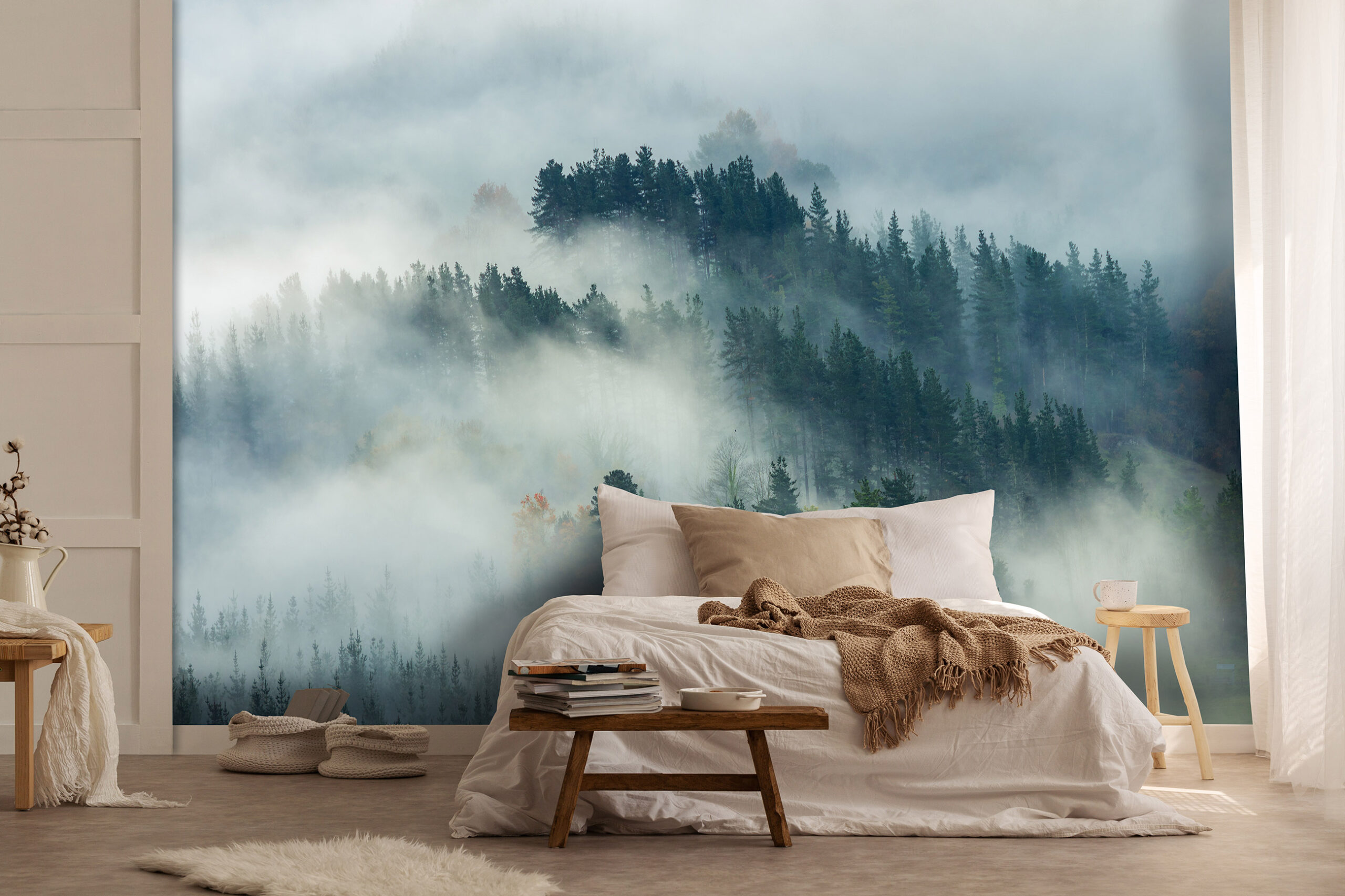 Hangulatos alpesi tájat lefestő fotótapéta, melynek köd burkolta fenyvesei átformálják az enteriőr atmoszféráját.