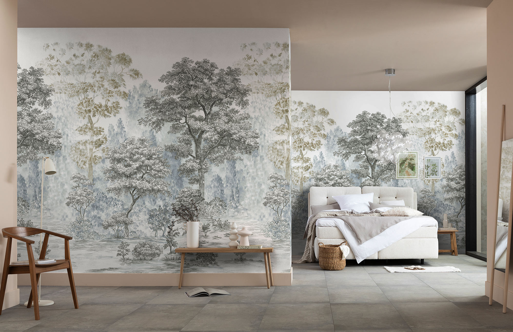 Harmonikus erdei kép, melyen a rajzolt fák a természetes szépséget jelenítik meg. Friss, üde minta, mely kellemes atmoszférát teremt az enteriőrben.