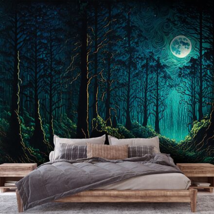 Misztikus erdei tájkép, melyet beragyog a telihold fénye.