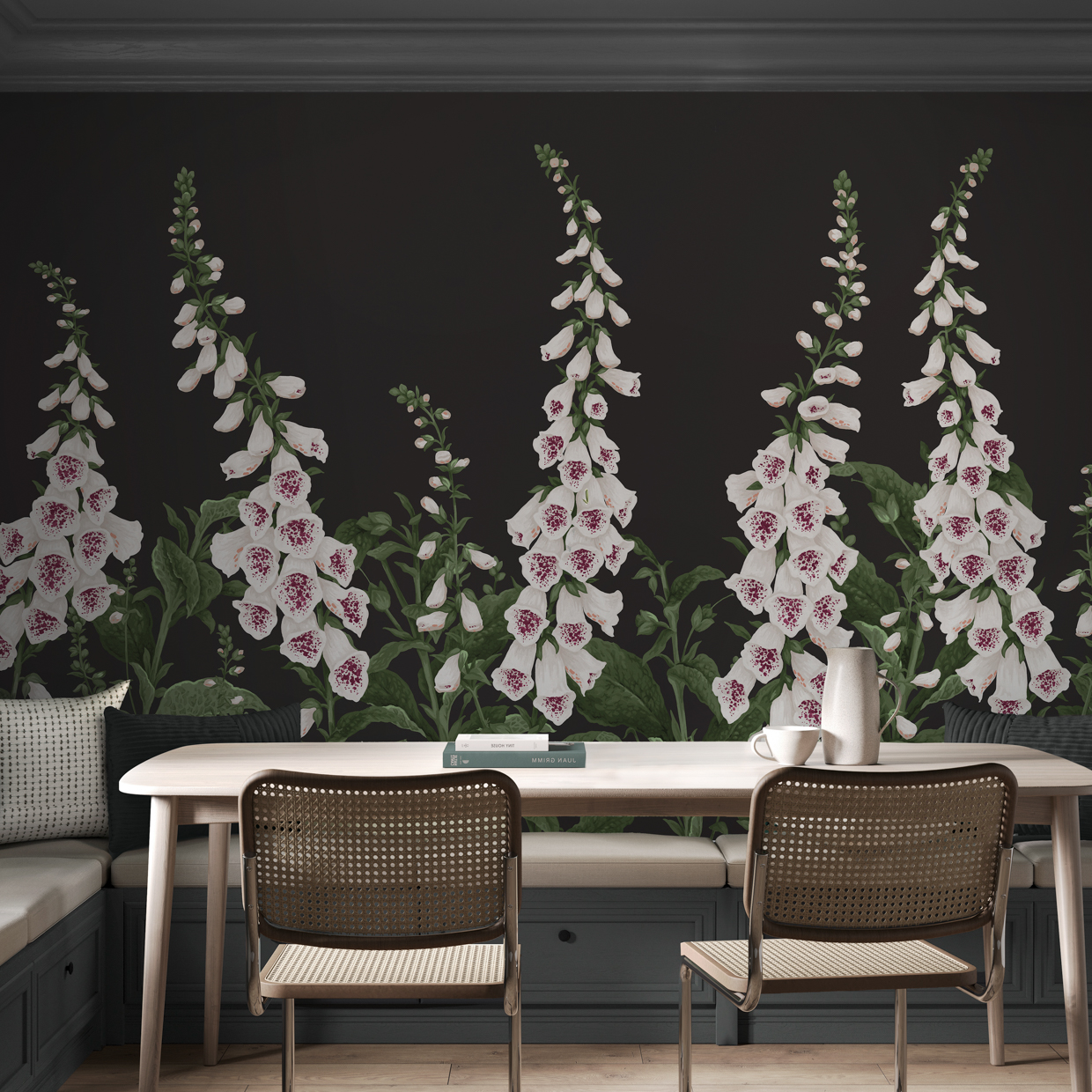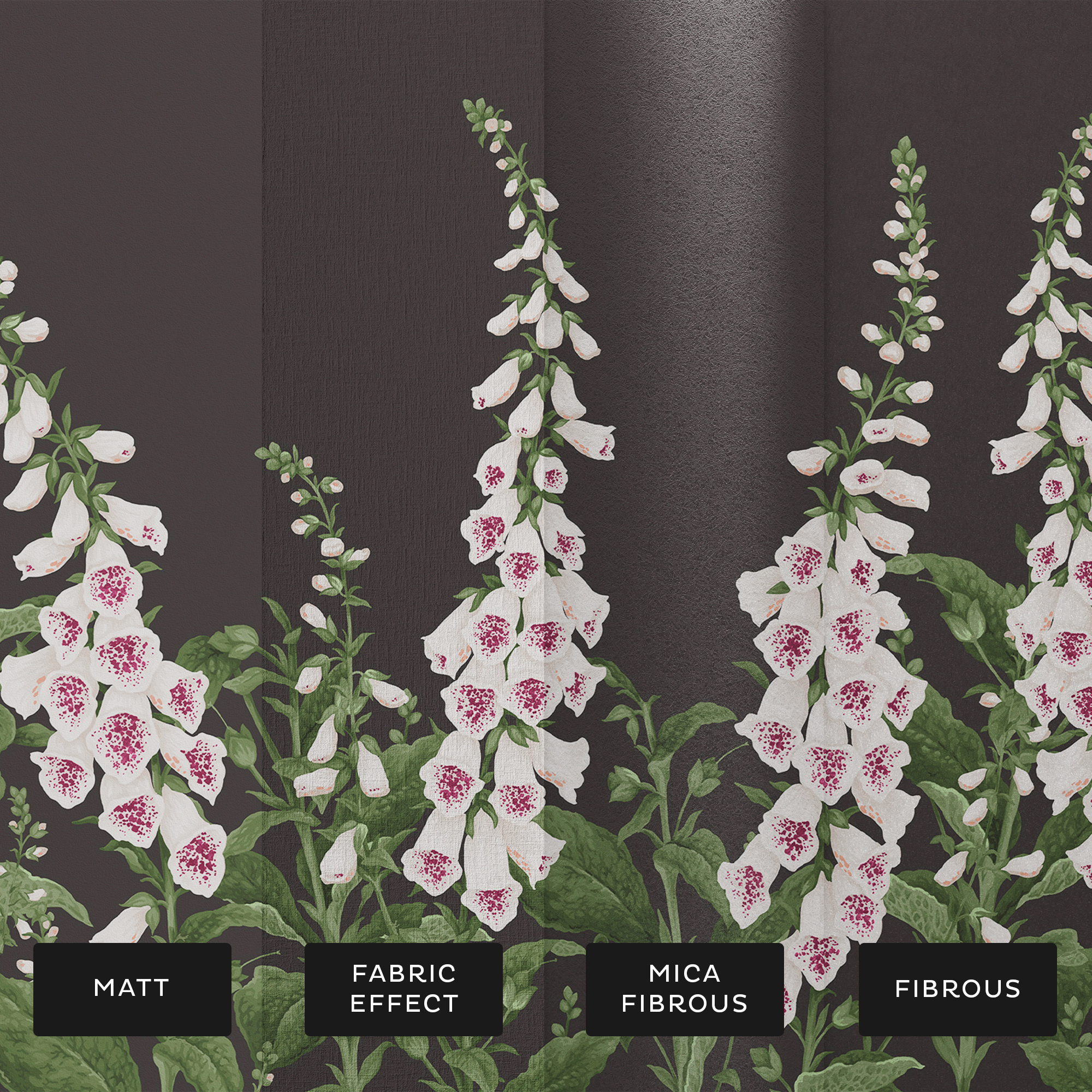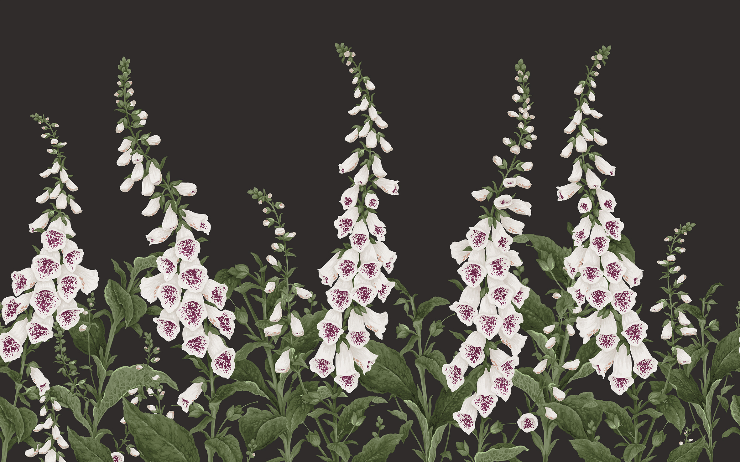 Fotótapéta nagy méretű gyűszűvirágokkal sötét alapszínnel