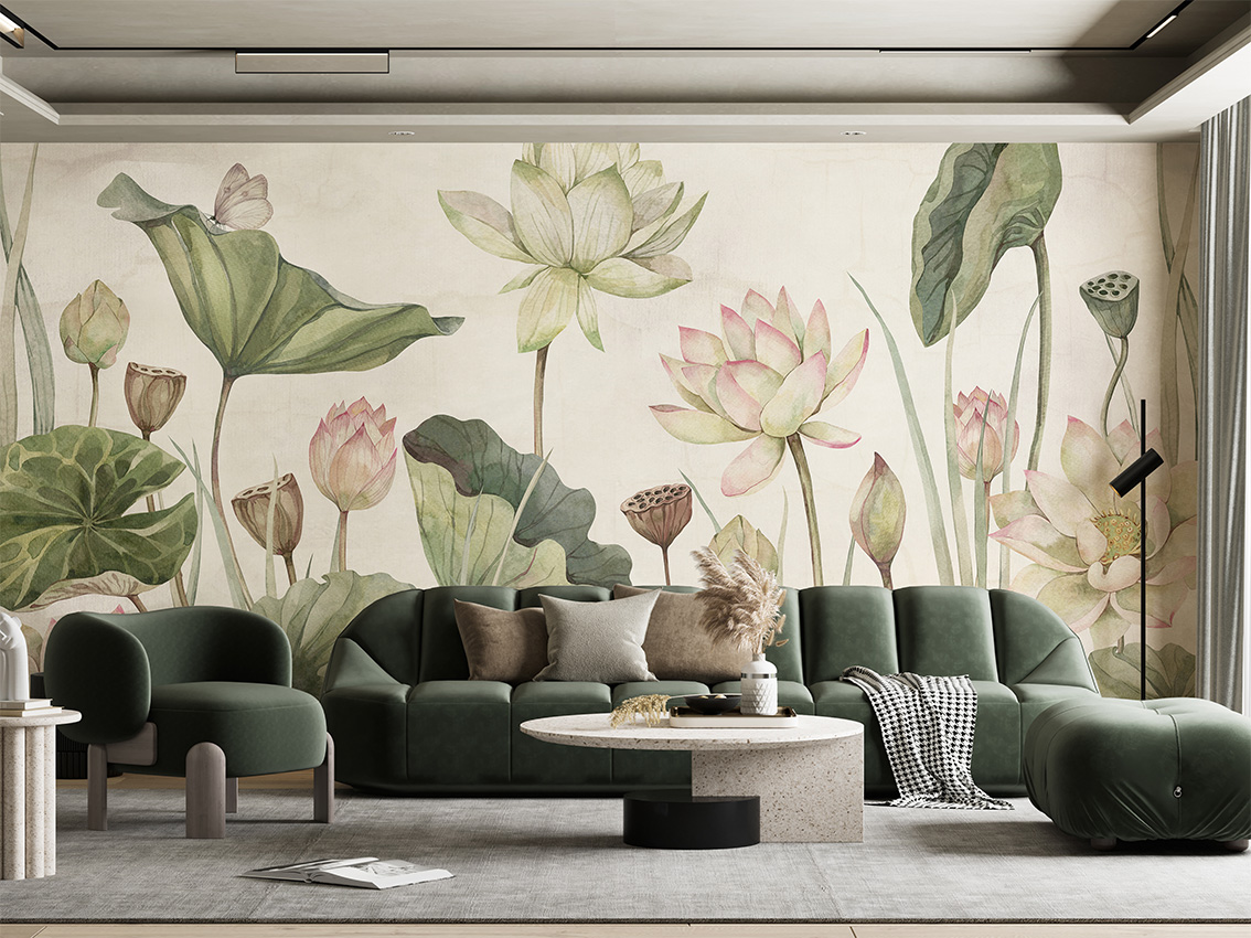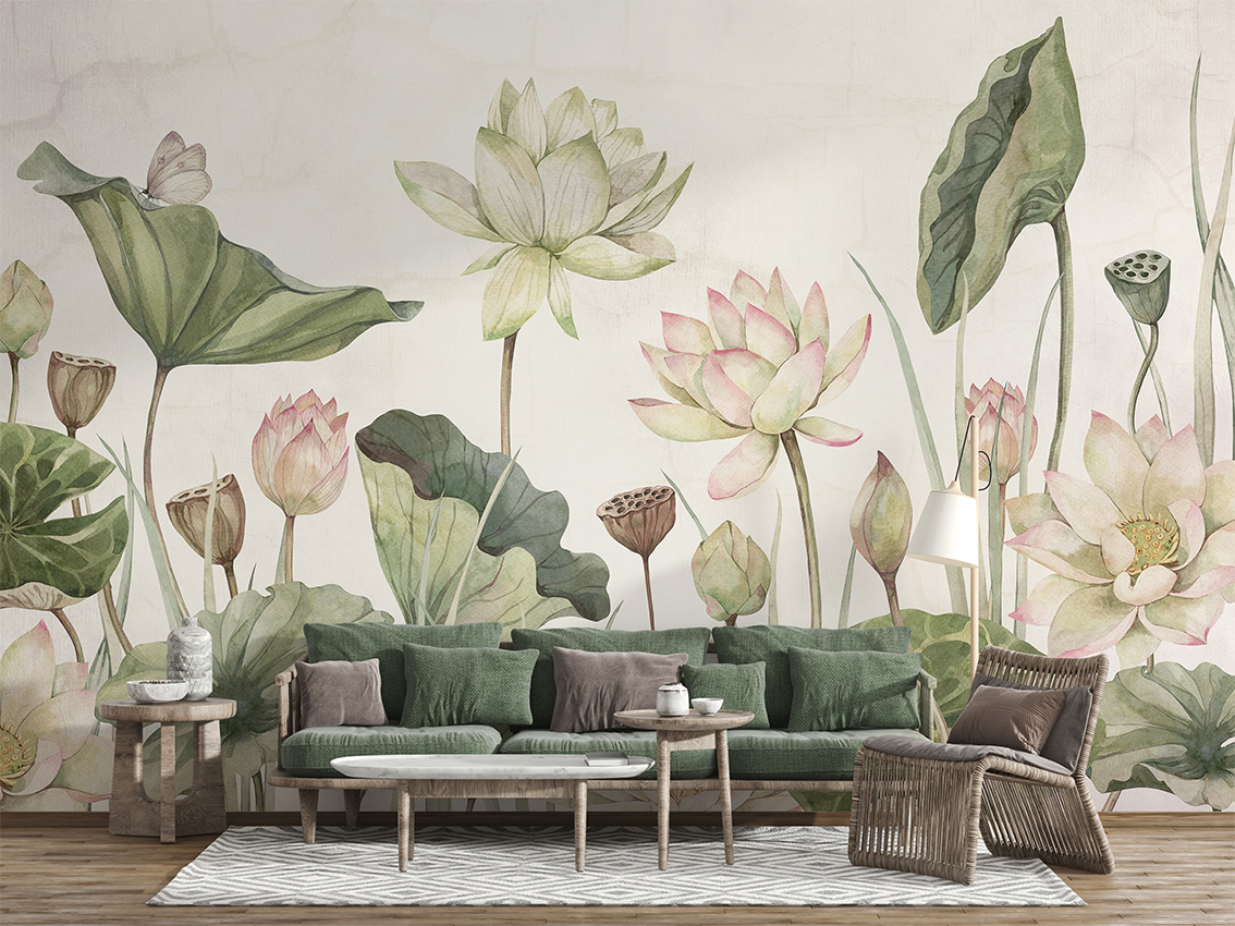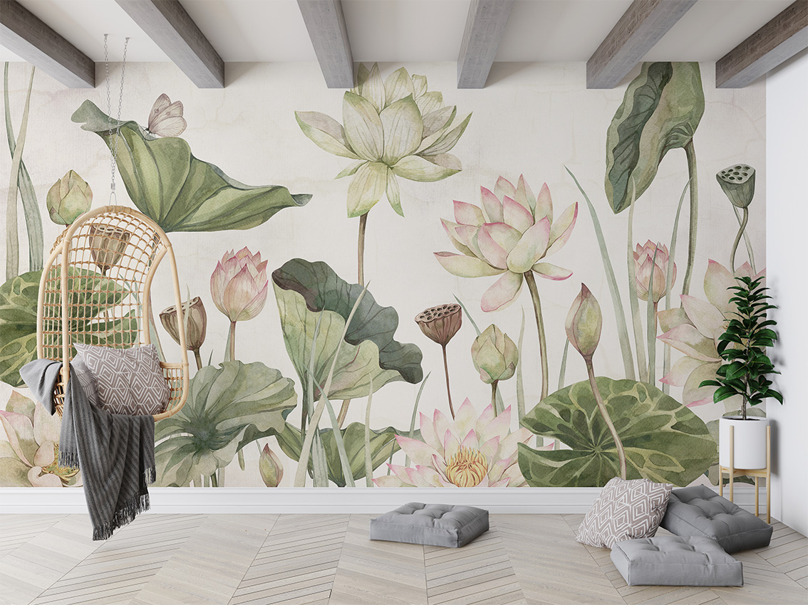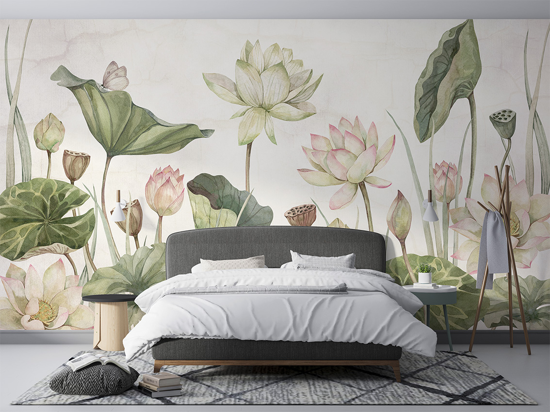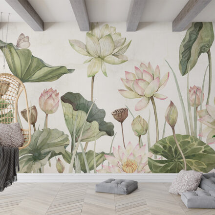Fotótapéta óriás tavirózsákkal, melyek kecses, romantikus formája eleganciát kölcsönöz az enteriőrnek.