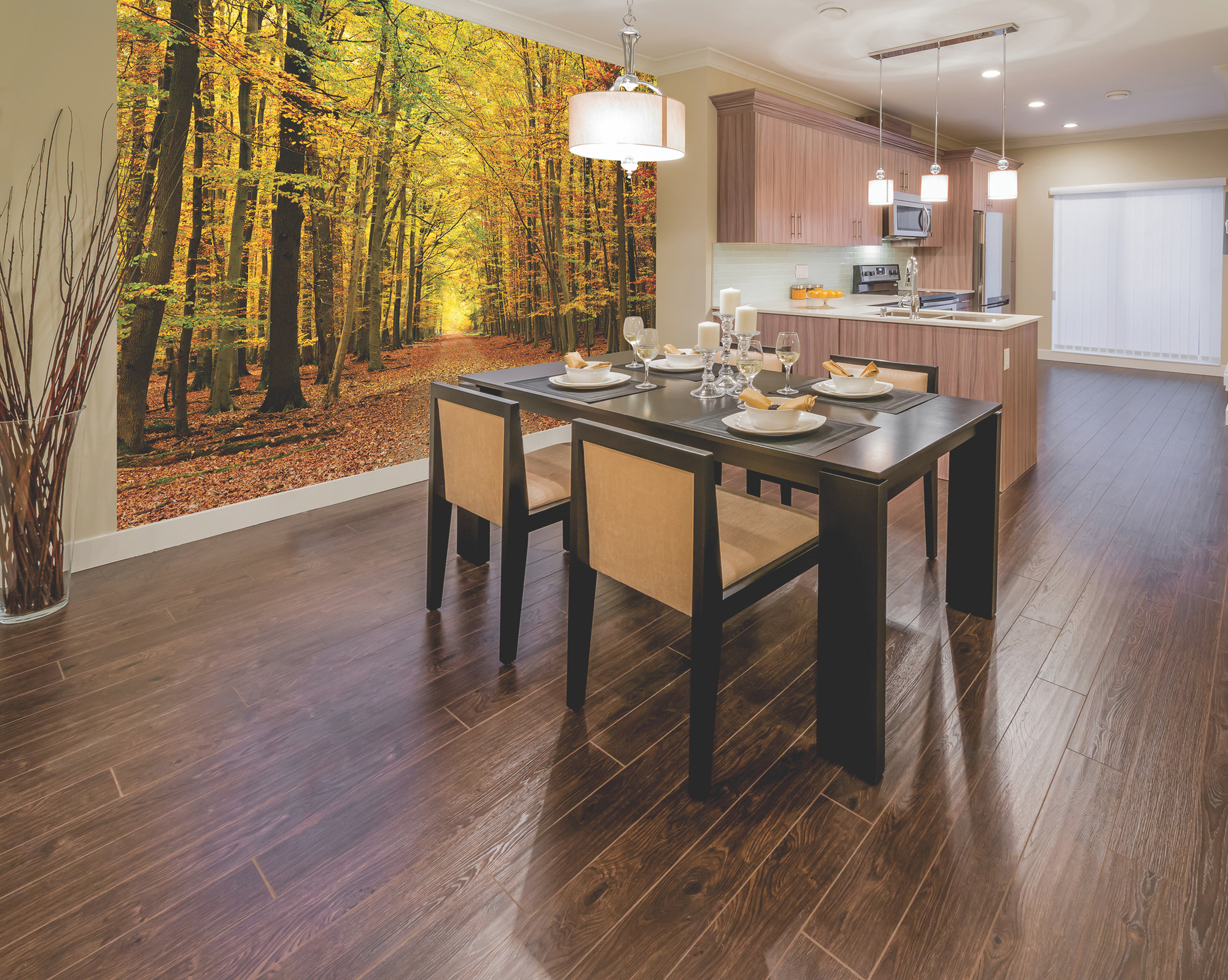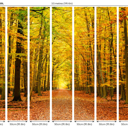 Fotótapéta őszi erdővel, melynek sárguló levelei között átszűrődik a napfény. Hangulatos fotótapéta, mely a természetet hozza be otthonunkba.