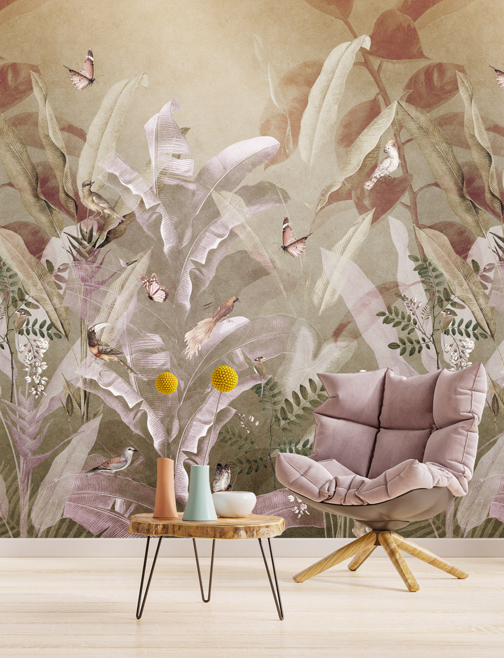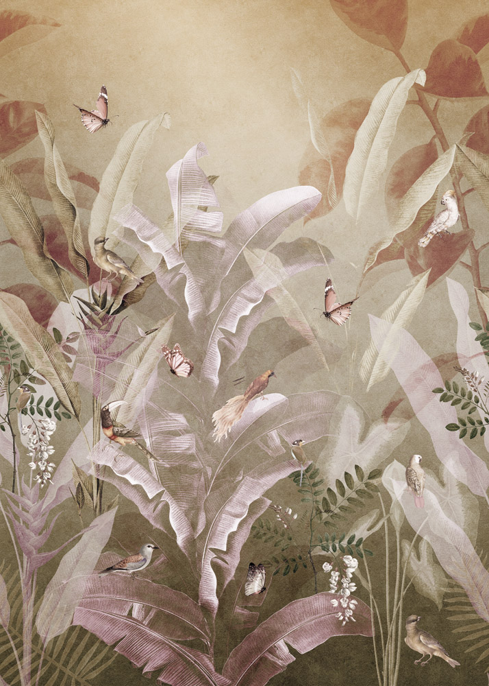 Izgalmas pálmaleveles fotótapéta, melynek egzotikus jellegét a pillangók és madarak egészítik ki. A fotótapéta sajátossága, hogy egymás mellé sorolható, így a minta illesztődik, és nagy felület tapétázására is alkalmas.