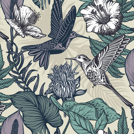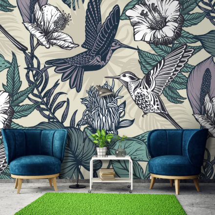 Fotótapéta rajzolt kolibri madarakkal, melynek igazi WOW élményt nyújt az enteriőrben.