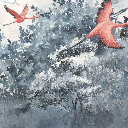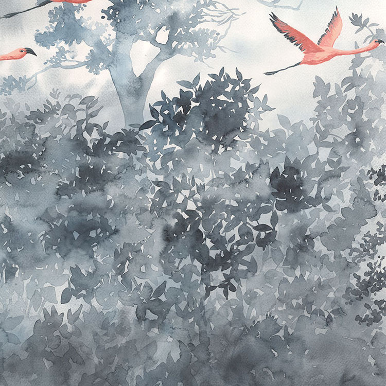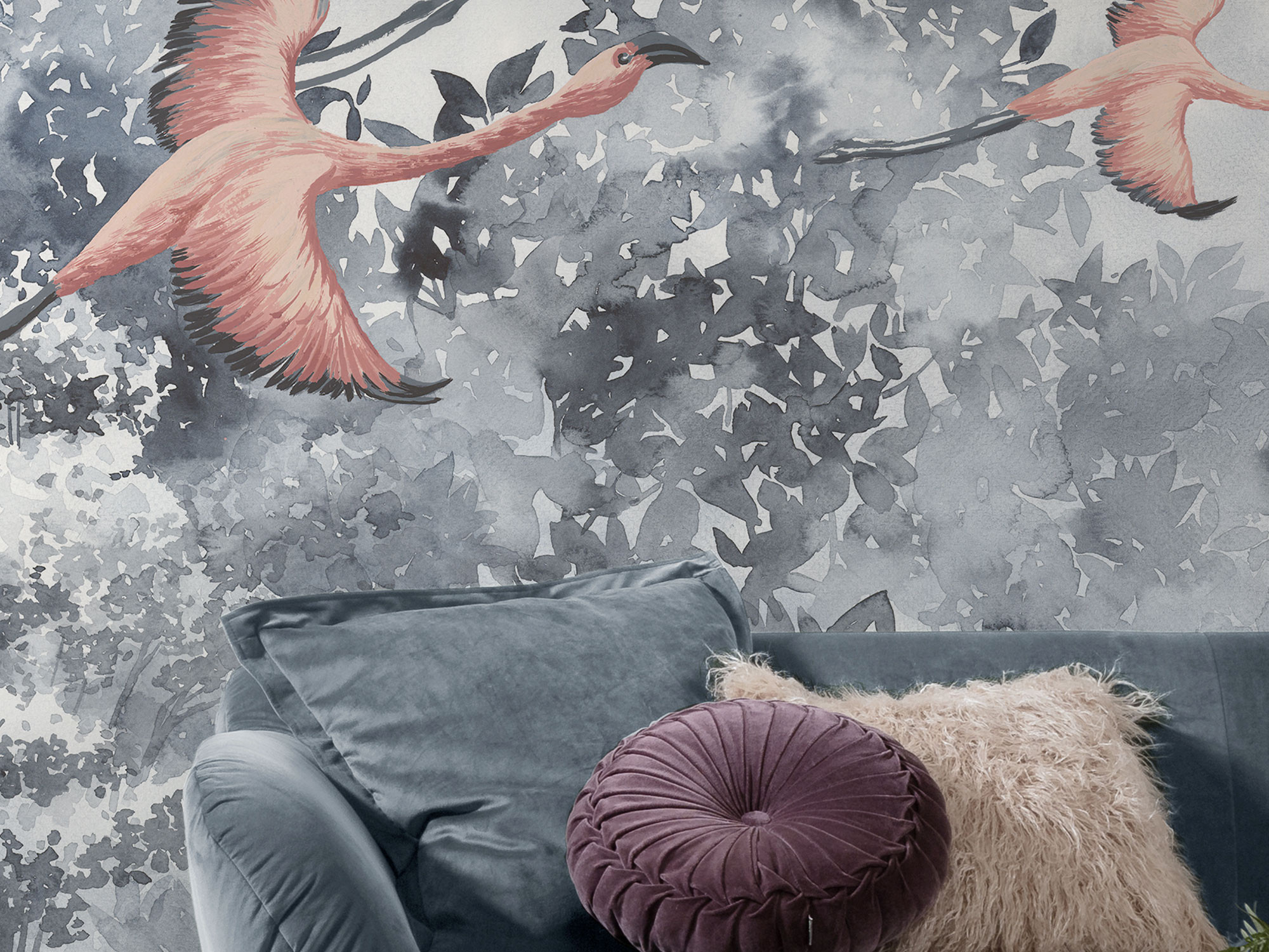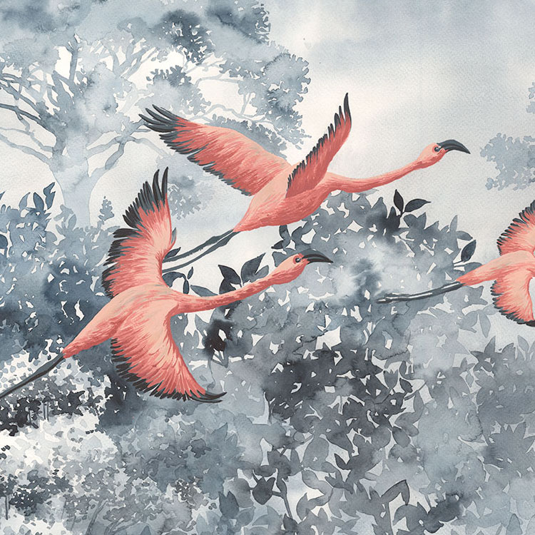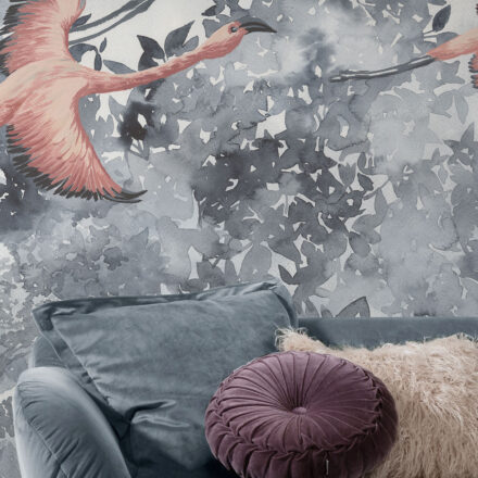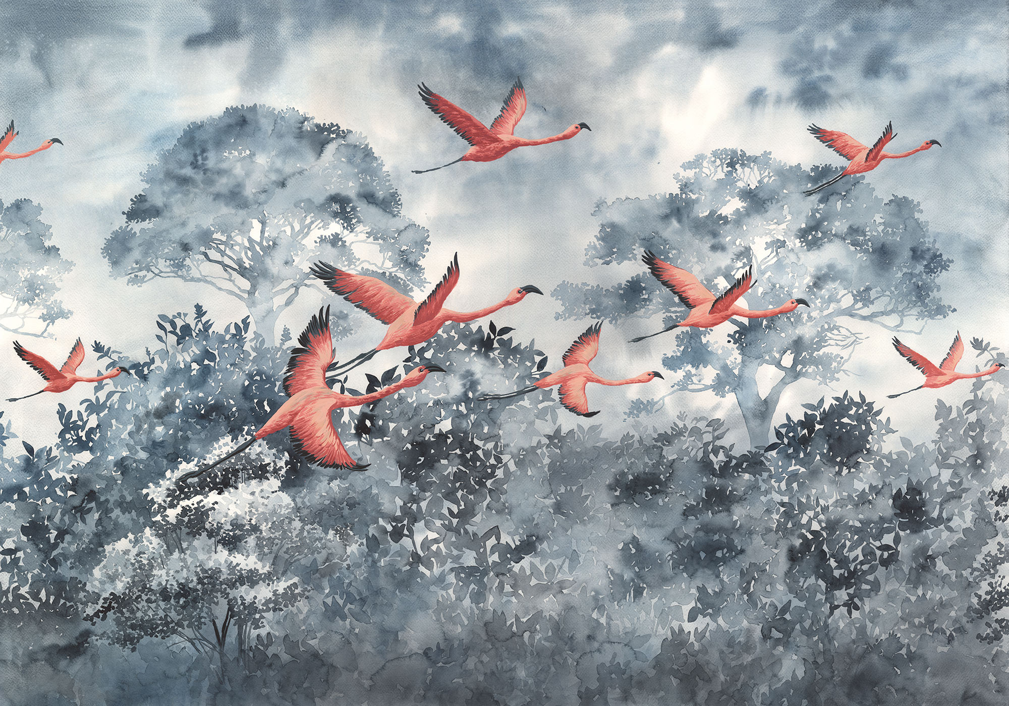 Fotótapéta repülő flamingókkal elegáns, magával ragadó látványt nyújt az enteriőrben. A flamingók földön, vízen, és az égben egyaránt kecses mozdulataikkal gyönyörködtetik a szemlélőt.
