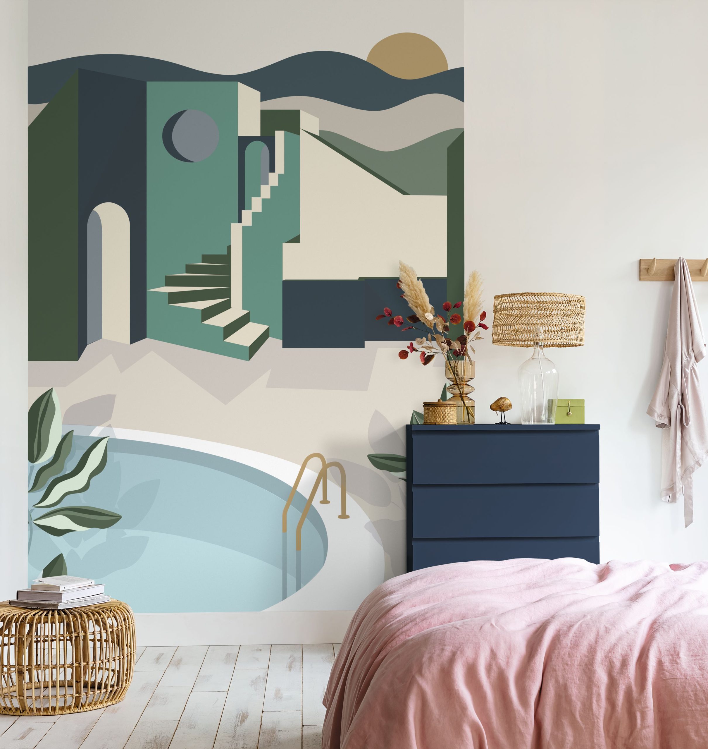 Modern, absztrakt formájú épületeket látunk az Archways poszter tapétán, melynek keki színe pompásan illeszkedik a mediterrán jellegű épületek világához.