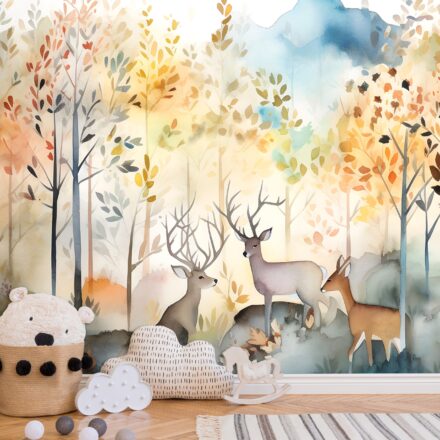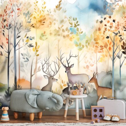 A hagyományos erdei állatos fotótapéta különleges változatát láthatjuk, melynek képe akvarell festményként jelenik meg szemünk előtt.