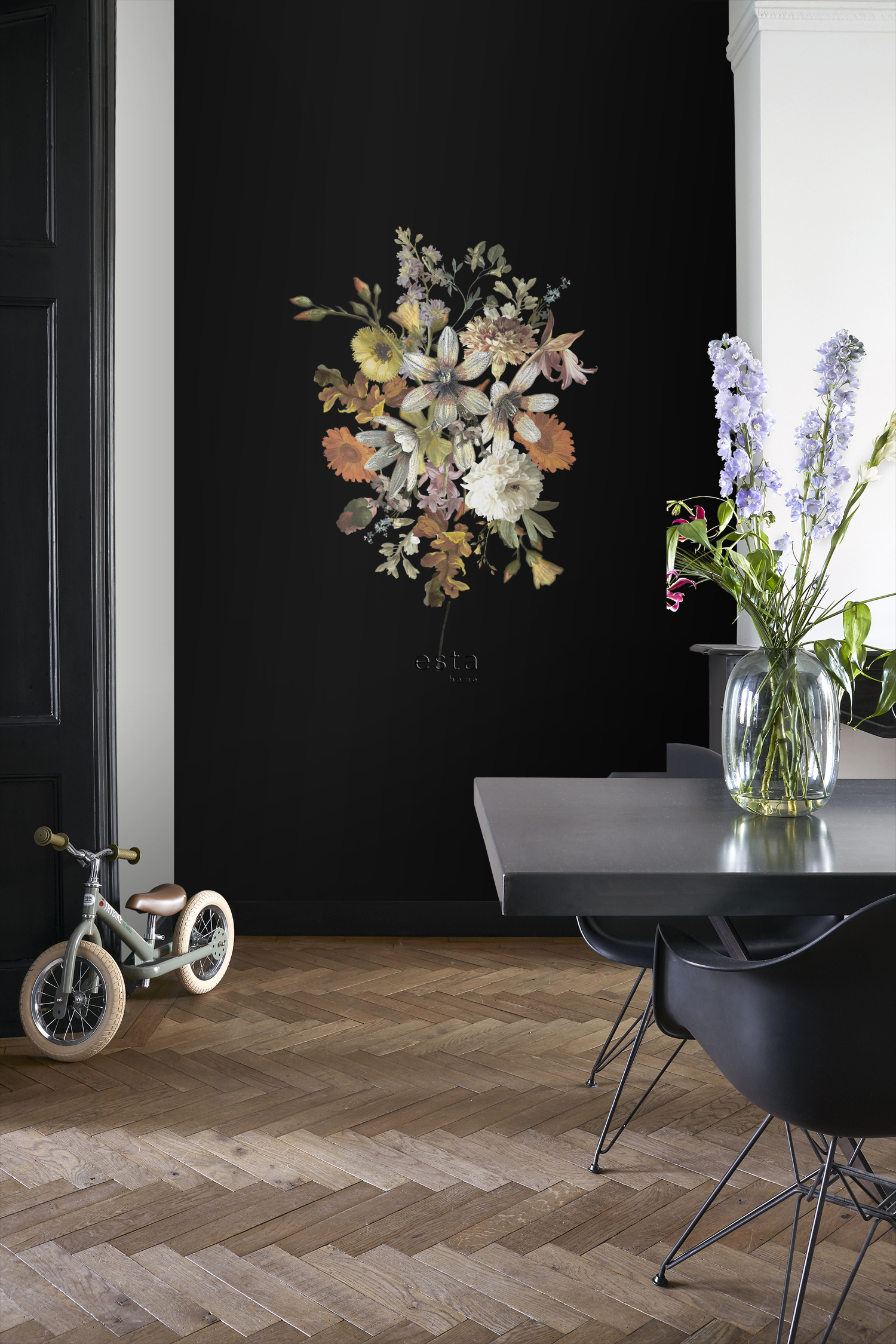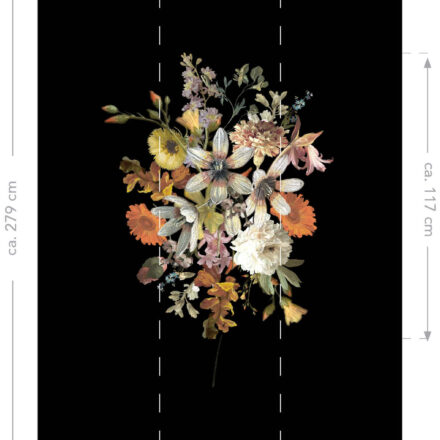 A színes virágcsokrot ábrázoló fotótapéta, melynek fekete alapszíne drámai kontrasztot teremt, a színpompás virágok kiemelkednek a sötét alapból és romantikus atmoszférát teremtenek.