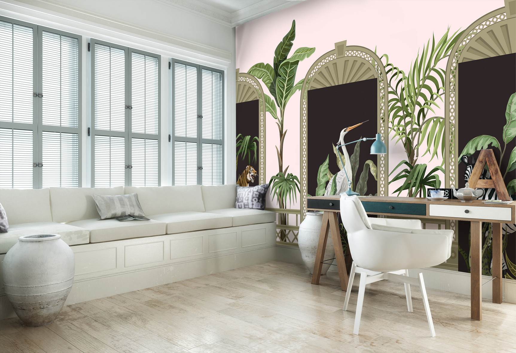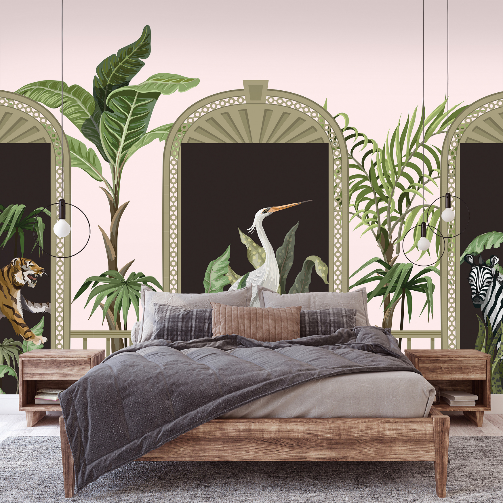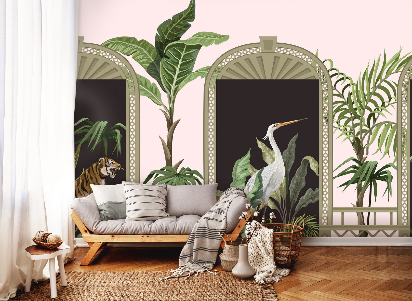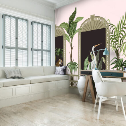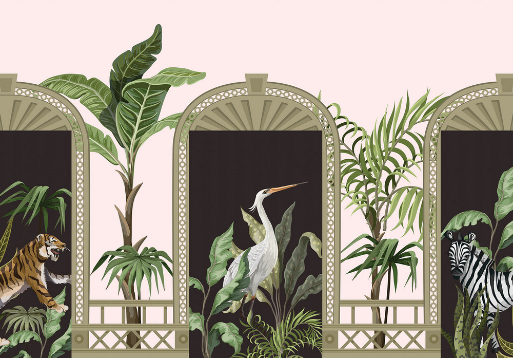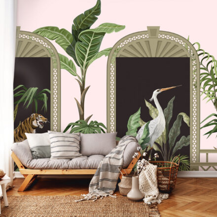 Kaput formáló fotótapéta, melyen vadállatok (zebra, tigris) nézz be ránk. A központi elemben nagyméretű darumadarat láthatunk. Érdekes motívum, mellyel nem pusztán érdekes dekorációt teremthetünk, de a kapu mintának köszönhetően meg is növelhetjük a szoba terét.