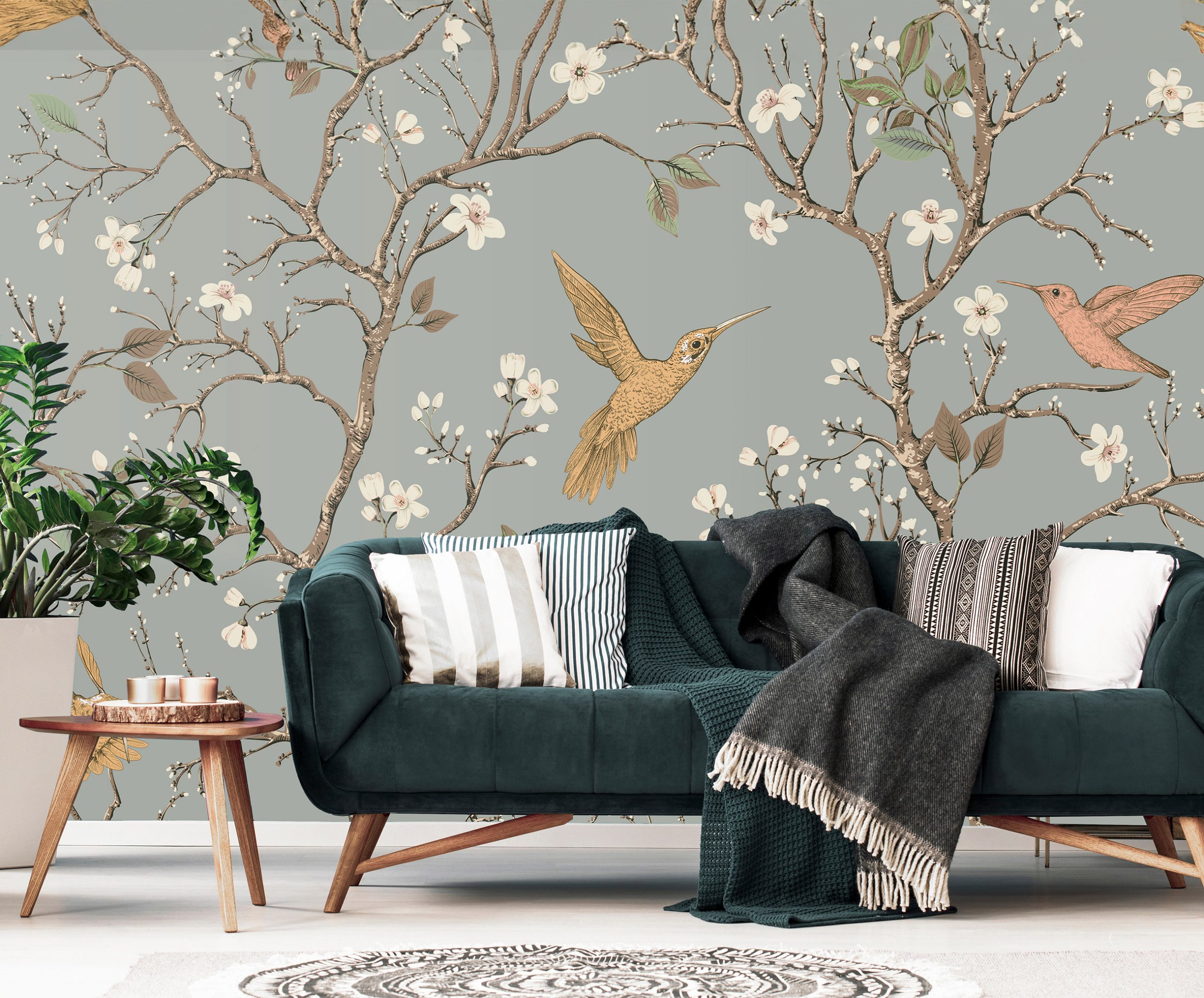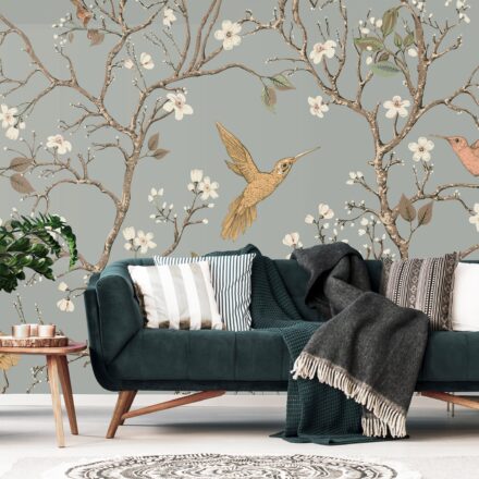 Angolos stílusú fotótapéta, melynek virágzó ágai között madarak repkednek.
