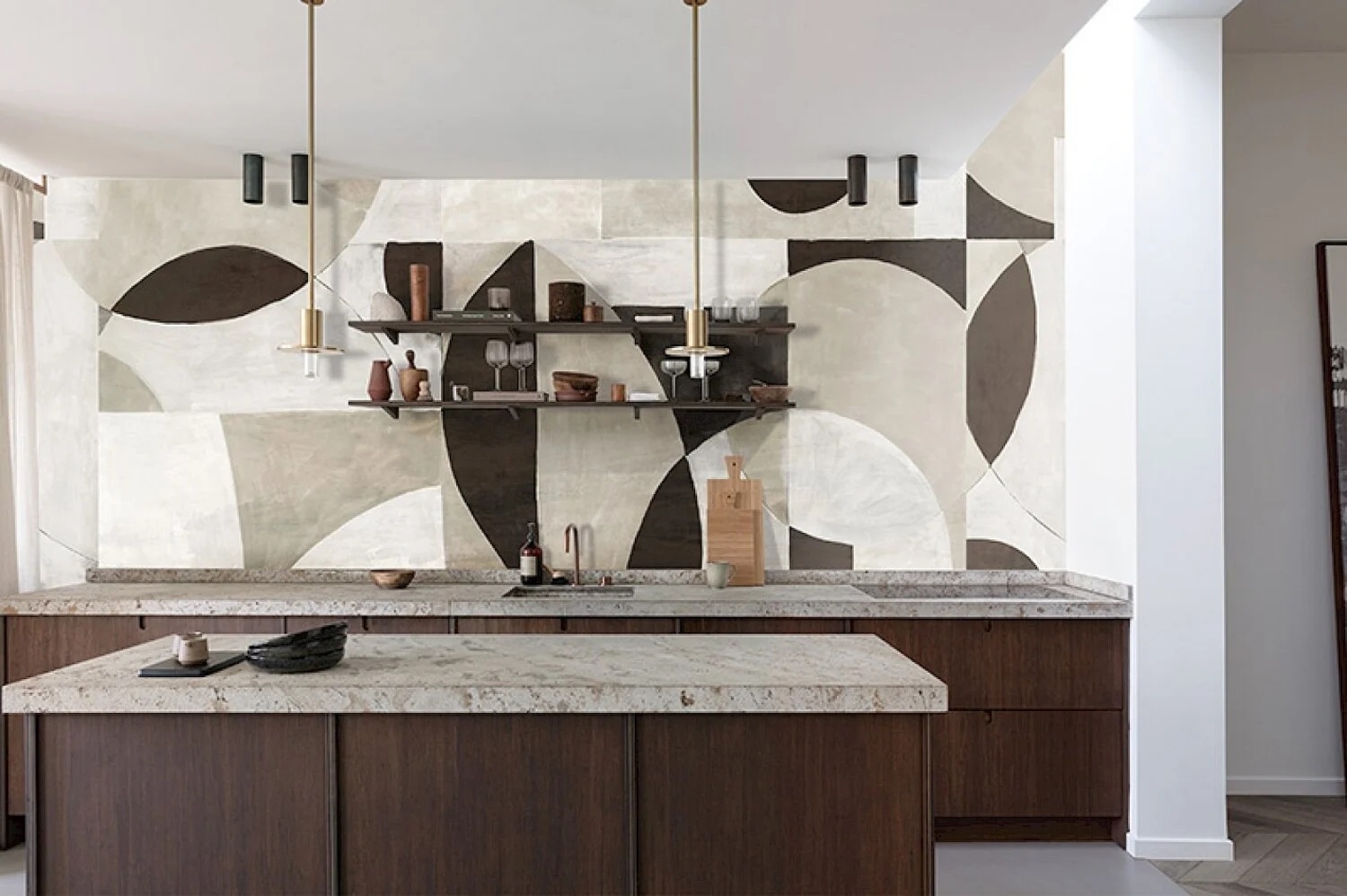 Trendi geometriai mintát bemutató fotótapéta, melynek modern, letisztult színvilága látványos dekorációt teremt a térben.