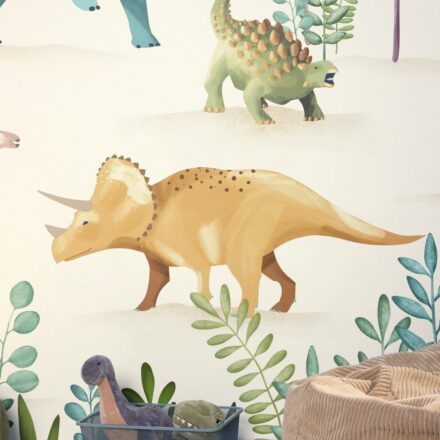 Gyerek fotótapéta a dinók birodalmáról, melyen kedvenc dinoszauruszaink jelennek meg – természetesen csak a békés természetű dinók, a brontosaurusz, triceratopsz. Kellemes, kékes zöldes árnyalatával remek választás kisfiúk szobájának dekorálására.