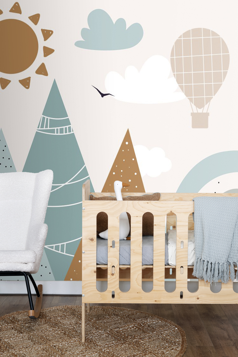 Gyerek fotótapéta rajzolt hegyekkel és szivárvánnyal, melyet a repülő madarak és hőlégballon még hangulatosabbá tesz. Vidámság és játékos hangulat lengi be a fotótapétát, mely mesés atmoszférát teremt a gyerekszobában.