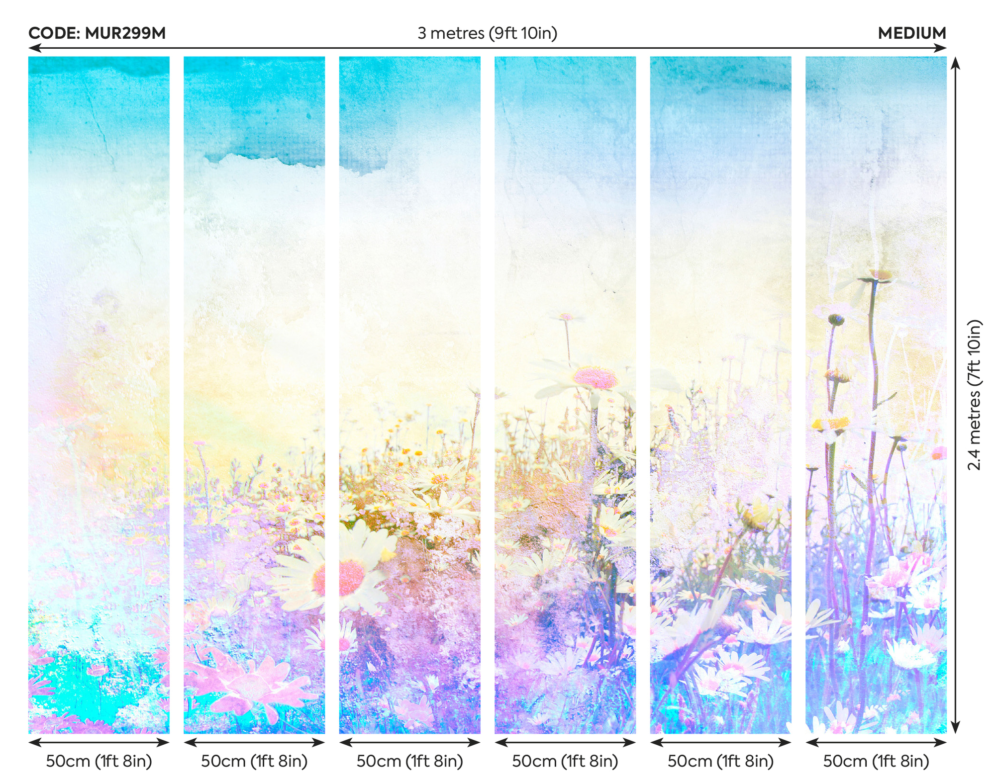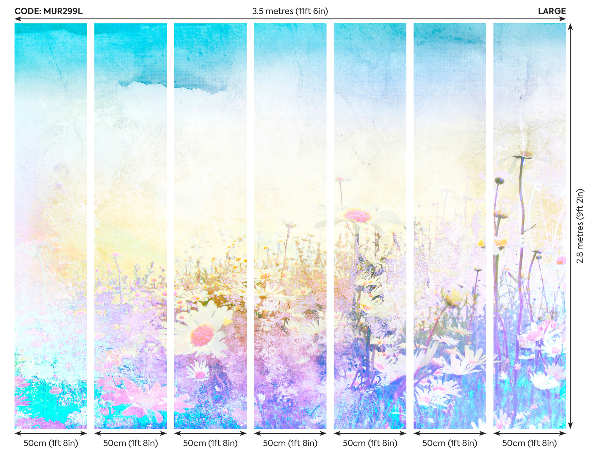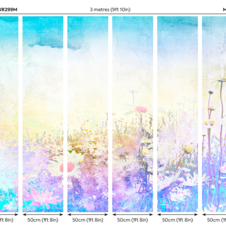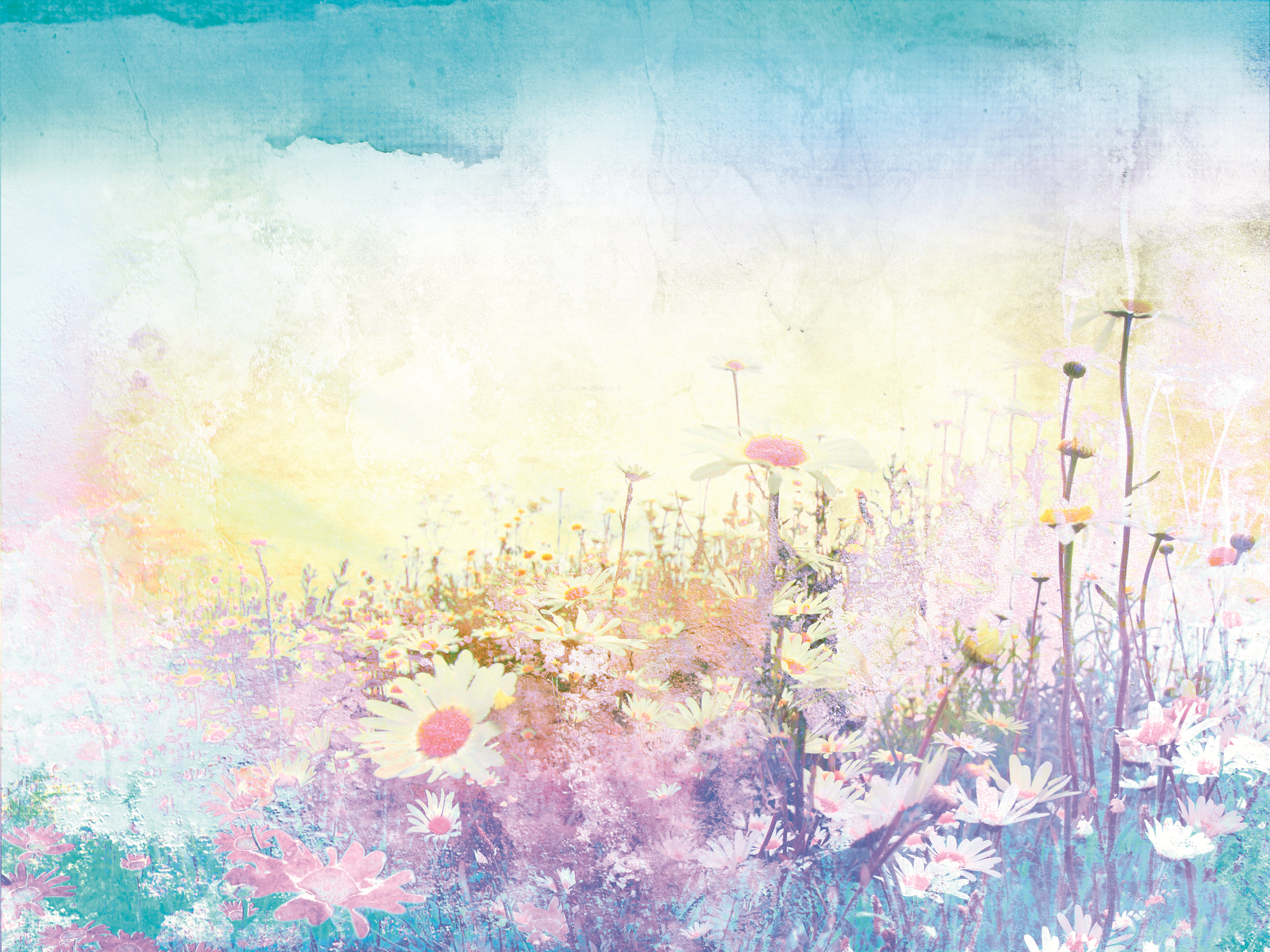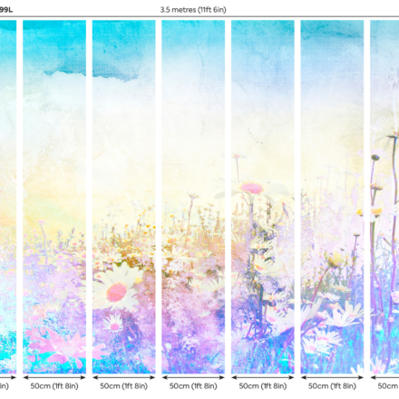 A tavaszi hajnal fényeiben látjuk a virágos rétet, melyet százszorszépek tarkítanak. Élénk színekben pompázó fotótapéta, melynek színei akvarell festményhez hasonlítanak.