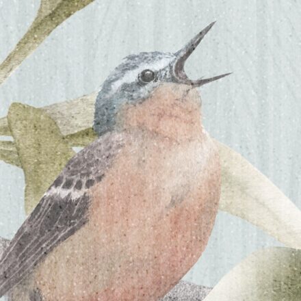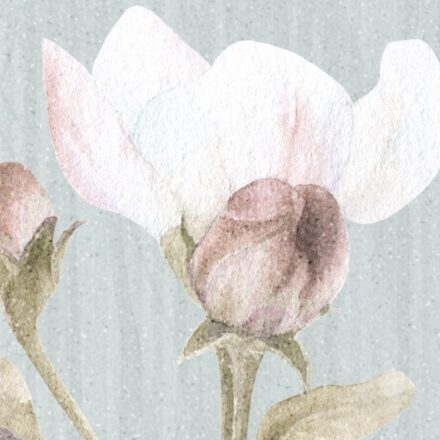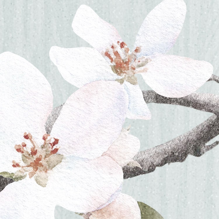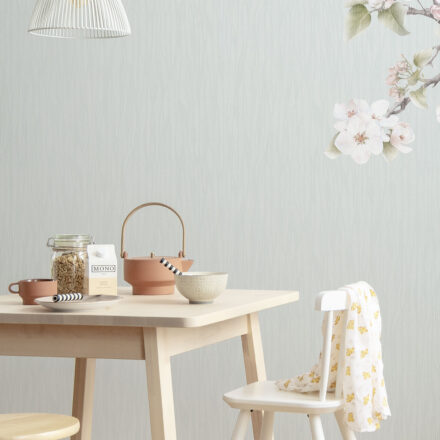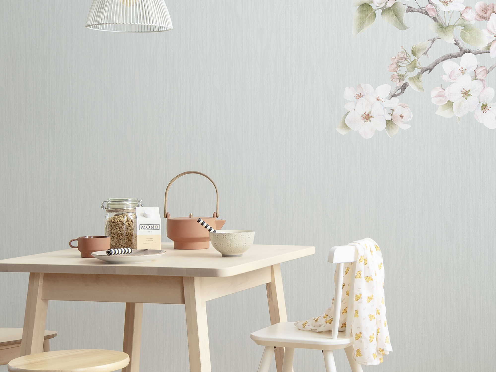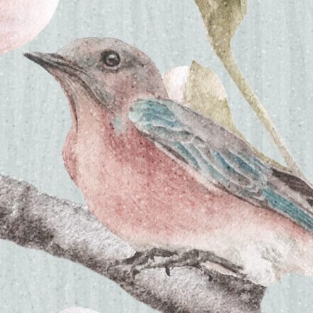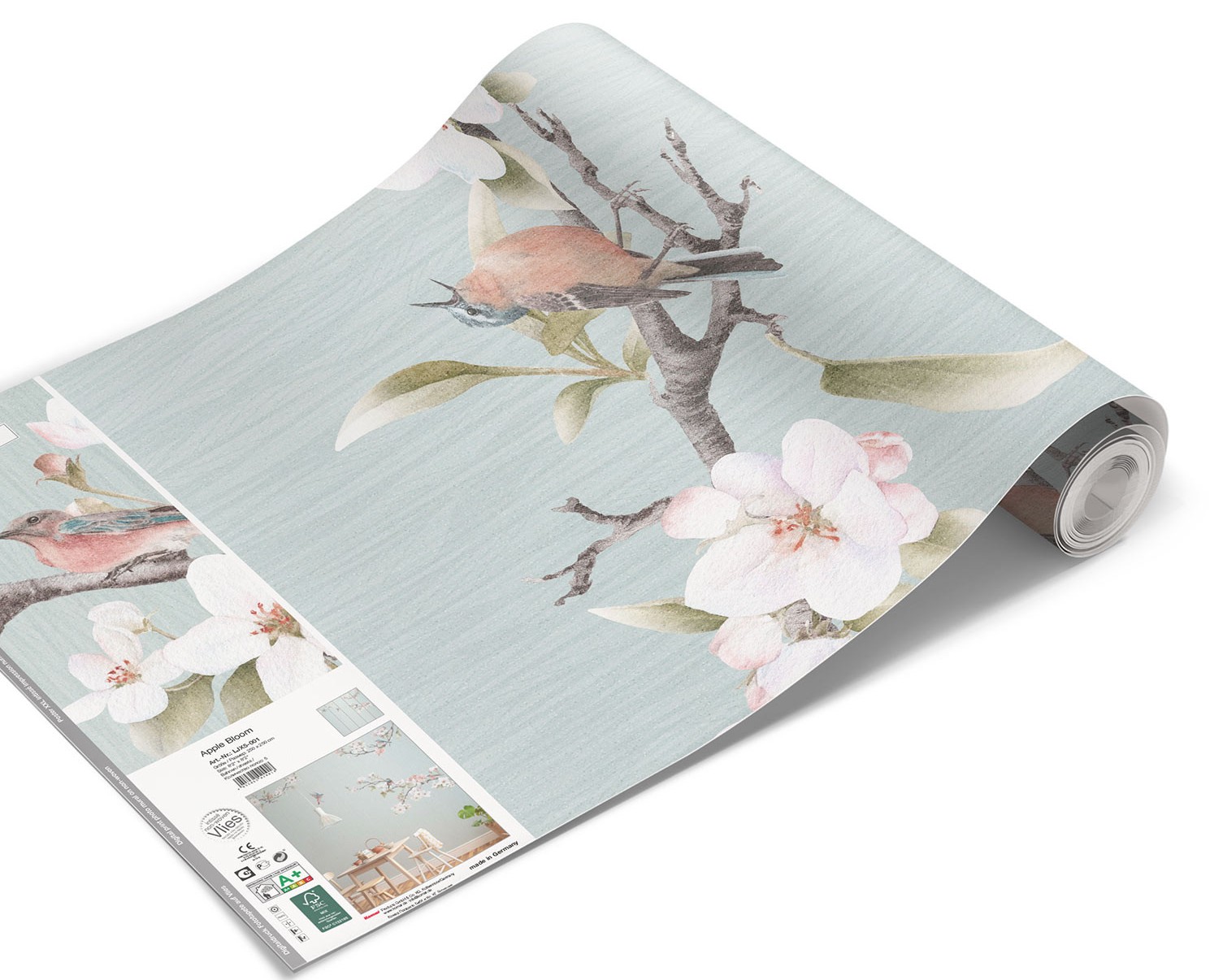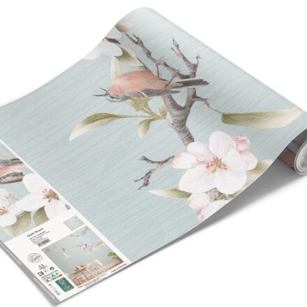 Halvány, pasztell színek, bájos énekesmadarak és virágzó almafa alkotja a tapéta kompozícióját, melynek romantikus atmoszférája átjárja az enteriőrt.
