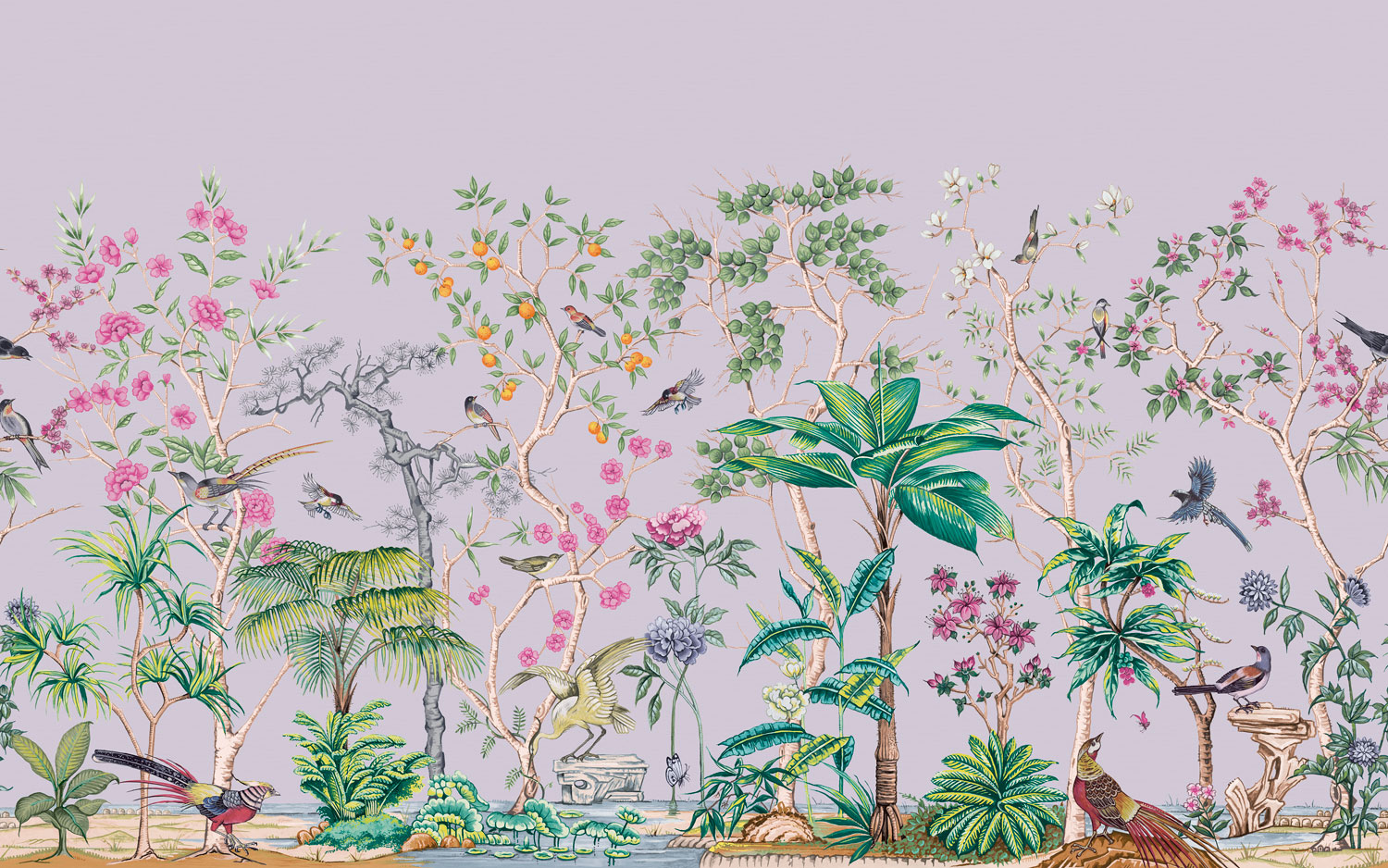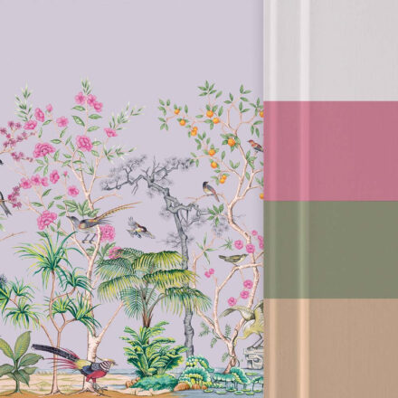 Halvány lila chinoiserie fotótapéta, melynek orientális stílusát a virágok és egzotikus madarak tökéletes összhangja alkotja meg izgalmas színekben. A fotótapétából áradó szépség a kelet harmóniáját jeleníti meg az enteriőrben.