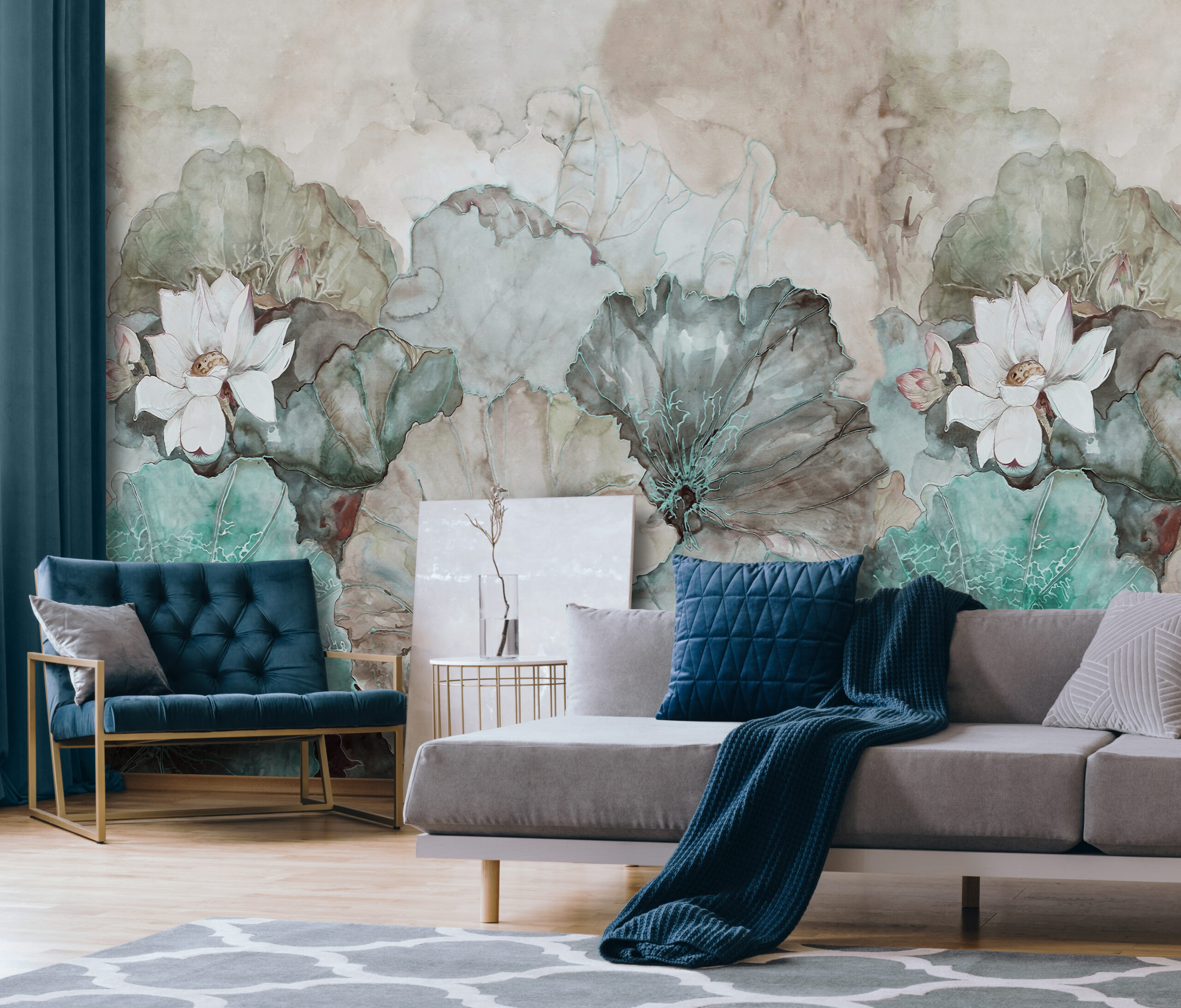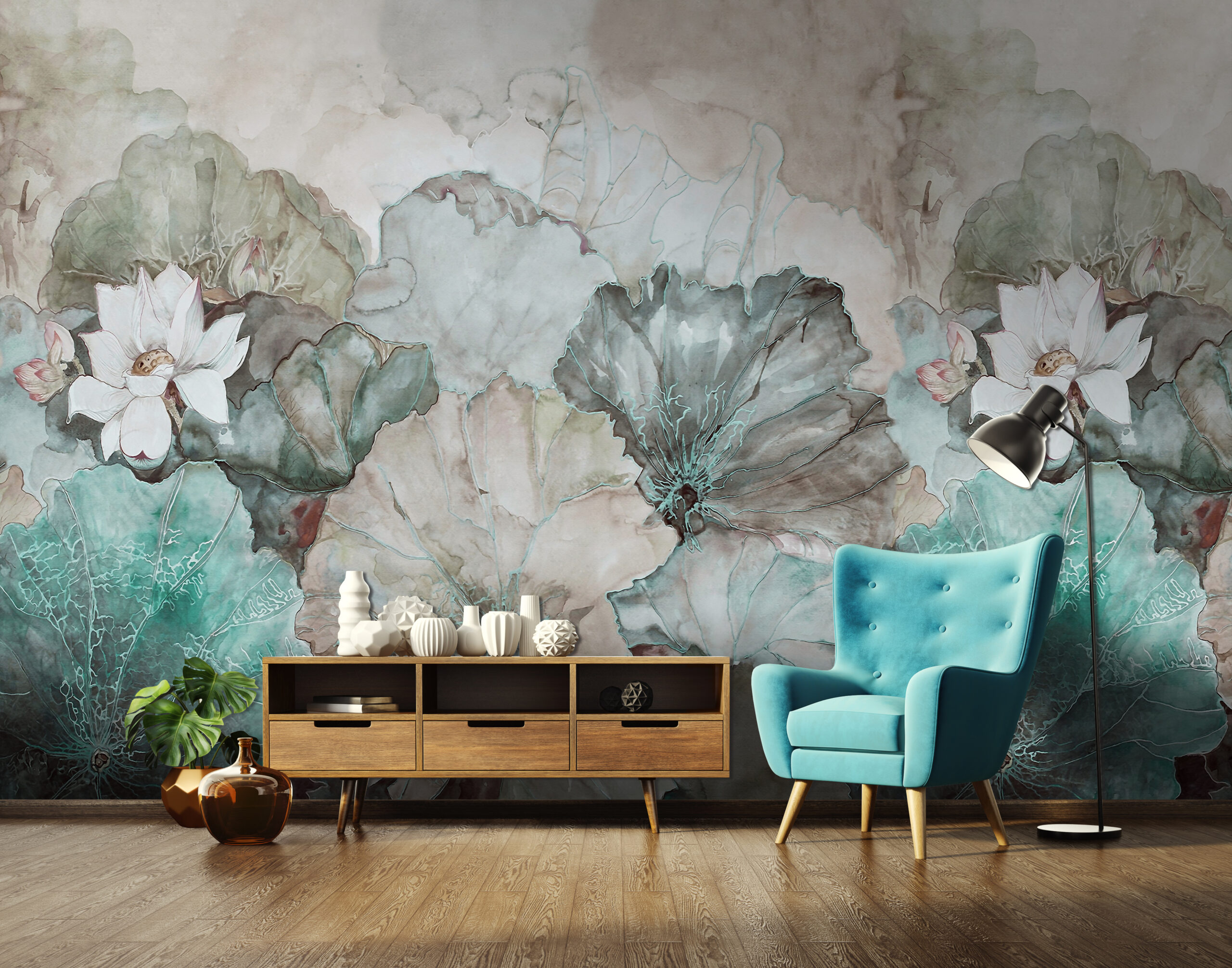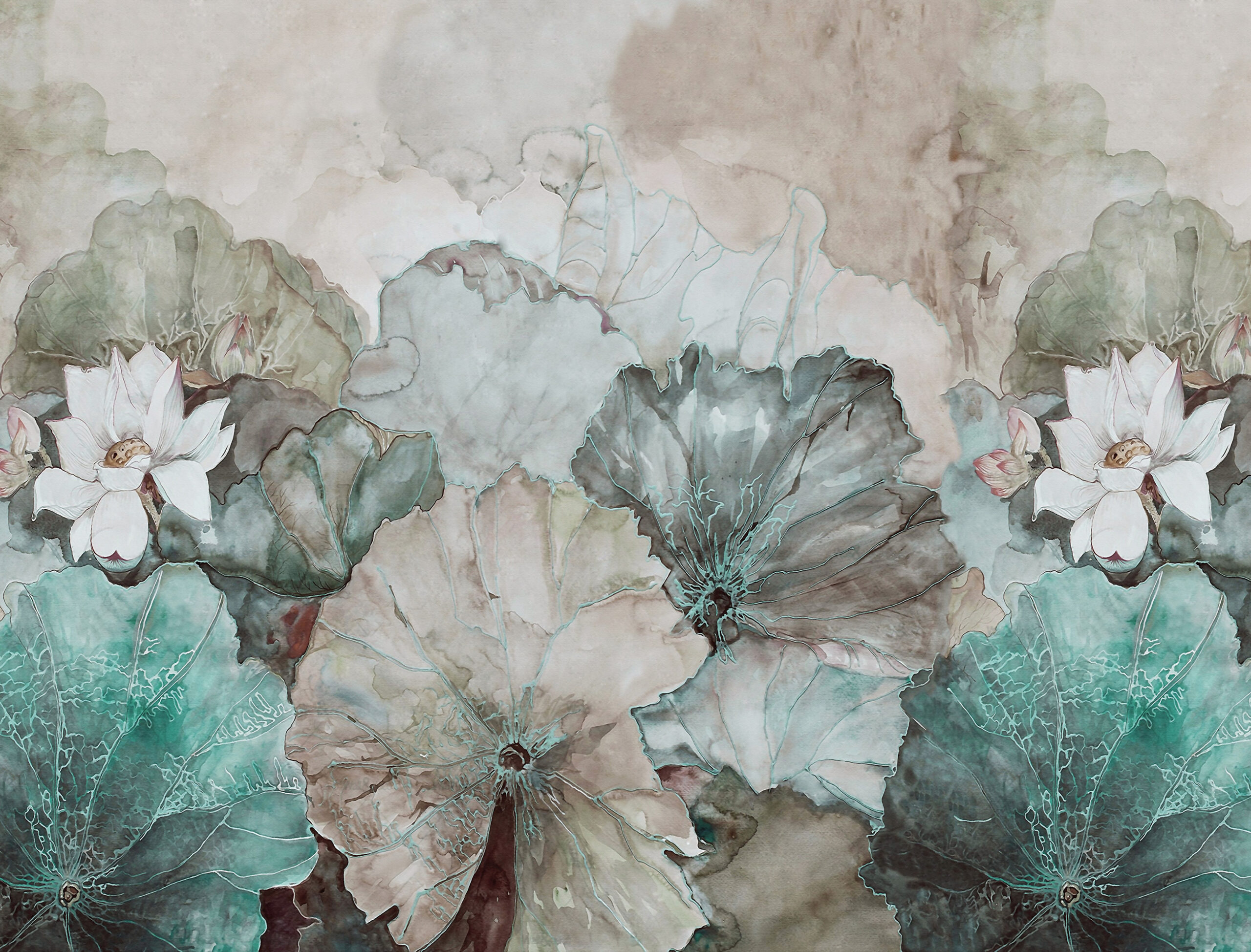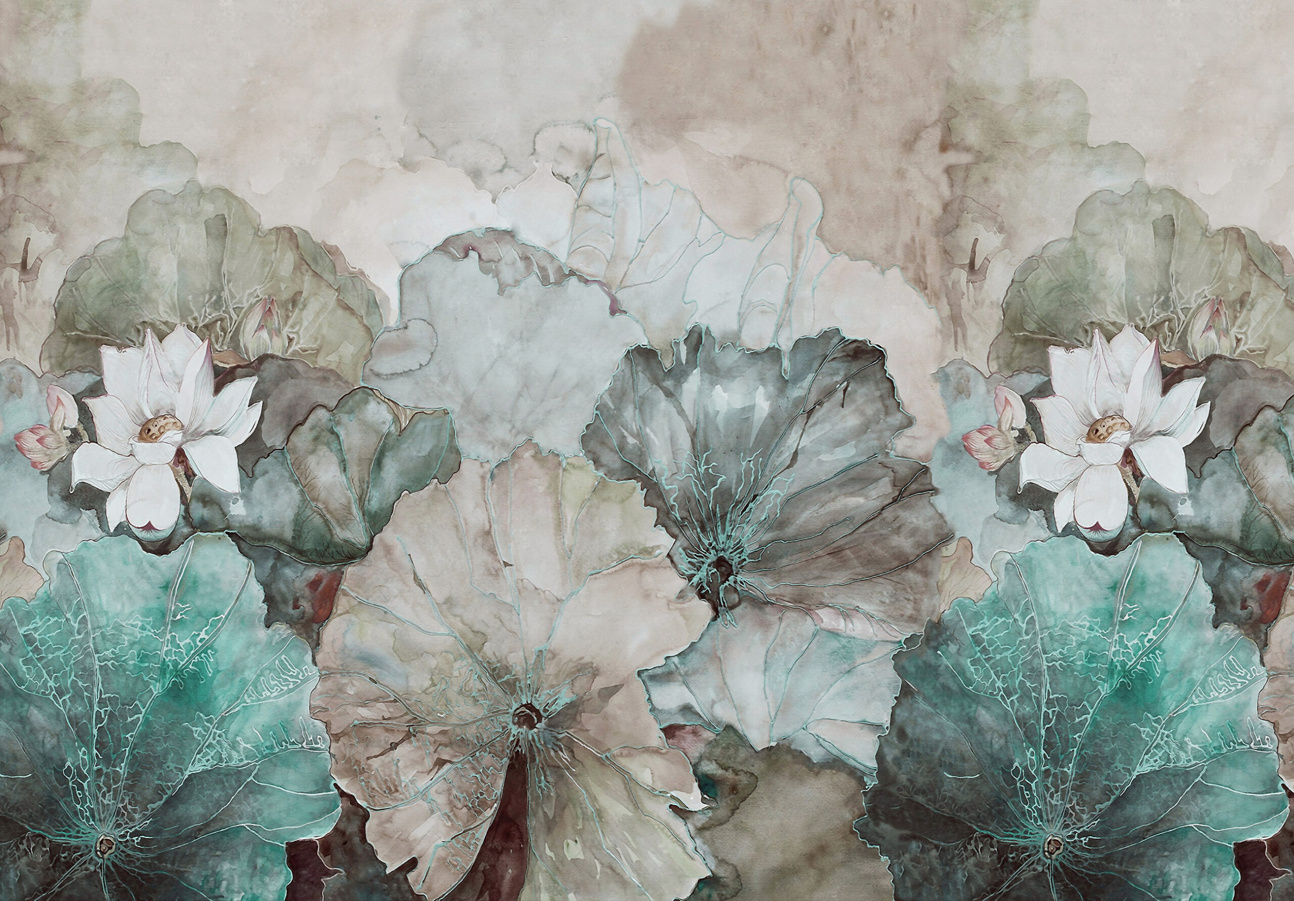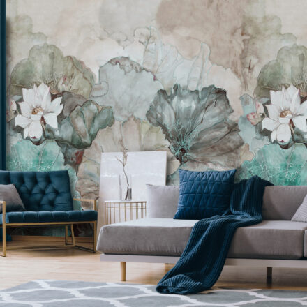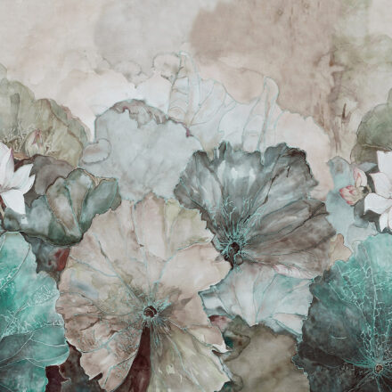 Hangulatos fotótapéta bézs–türkiz tavirózsa levelekkel – lágy színeivel és elegáns mintájával igazi nyugalom szigetét teremti meg otthonodban. A bézs háttér és a türkiz tavirózsák harmonikus játéka különleges, mégis természetes atmoszférát varázsol bármely helyiségbe.