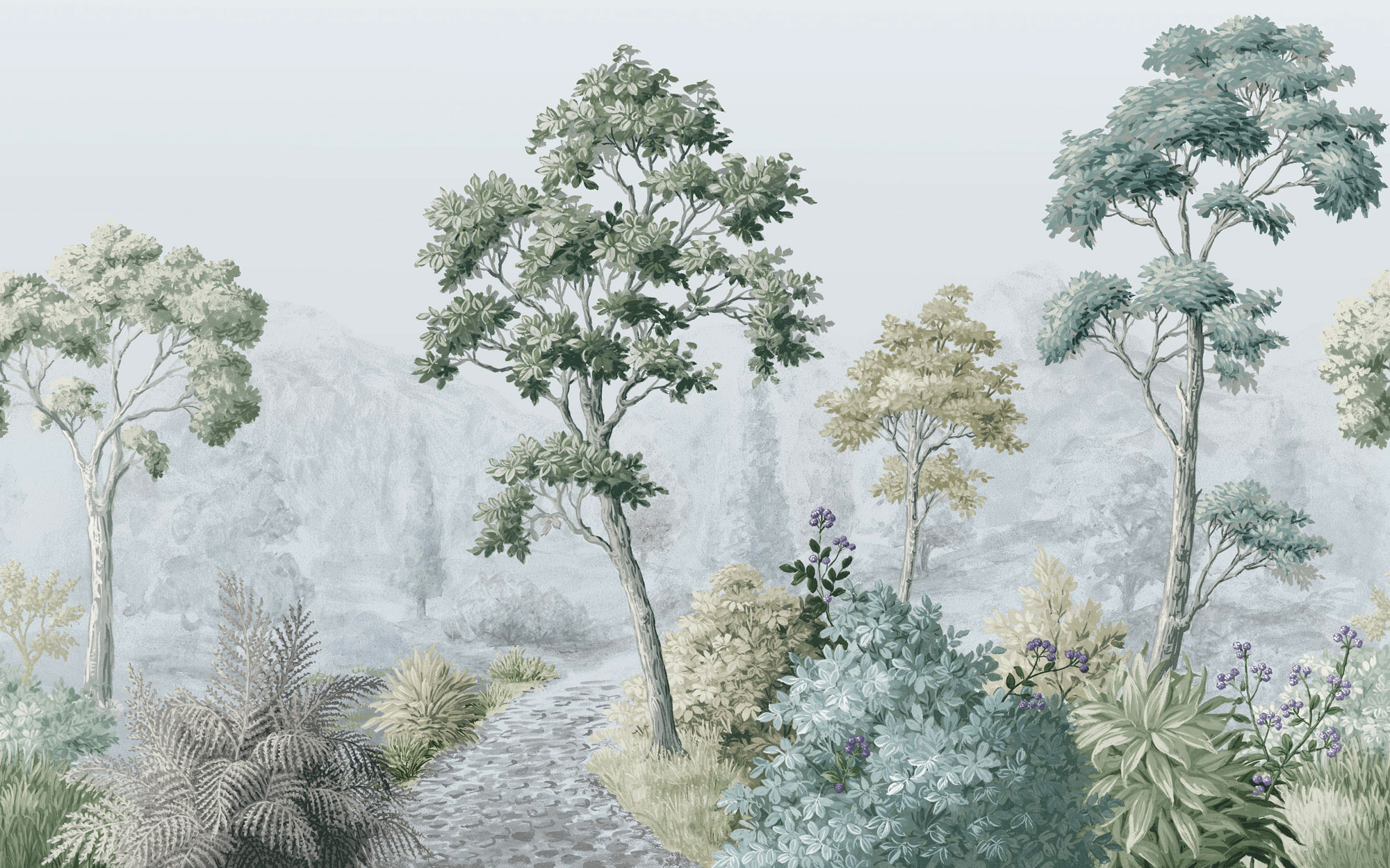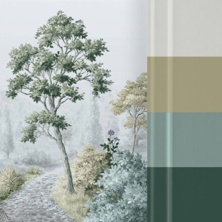 Ködös reggelek harmonikus tájképe tárul elénk a fotótapétán, melynek festett fái és bokrainak nyugalmat sugárzó atmoszférája van. Visszafogott színeinek köszönhetően kellemes dekoráció lehet bármelyik helyiségben.