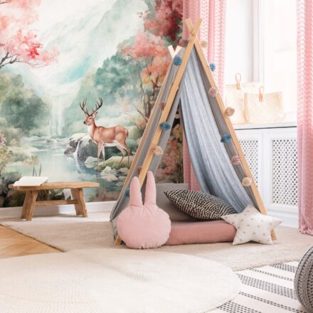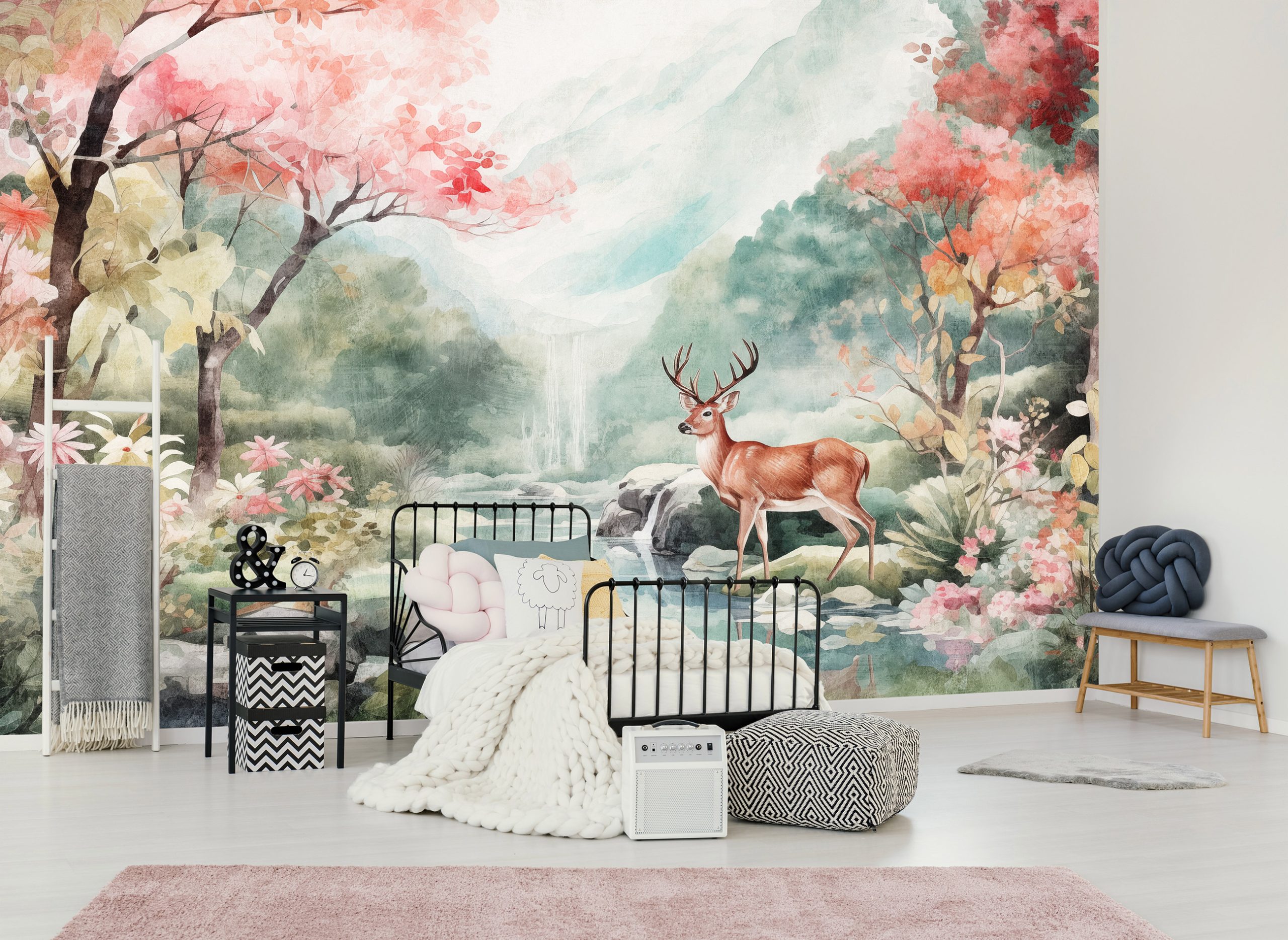 Idilli tájképet ábrázoló fotótapéta, melyen a nemes szarvas az erdei pataknál látható.