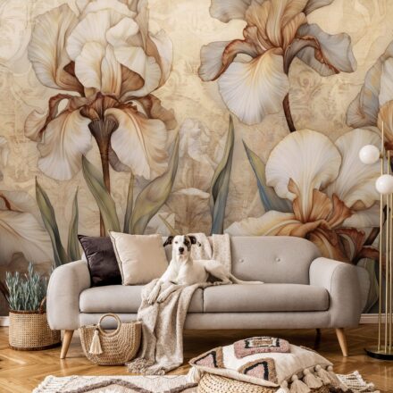 Különleges fotótapéta, melyen a nagy méretű íriszek festményként pompáznak. A tapéta kellemes árnyalata otthonos melegséget teremt, a virágok szépsége pedig nőies romantikát sugároz.