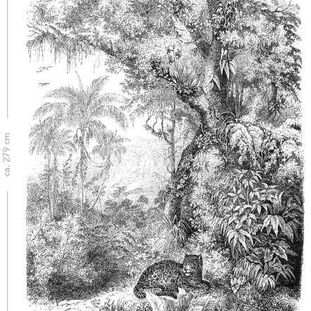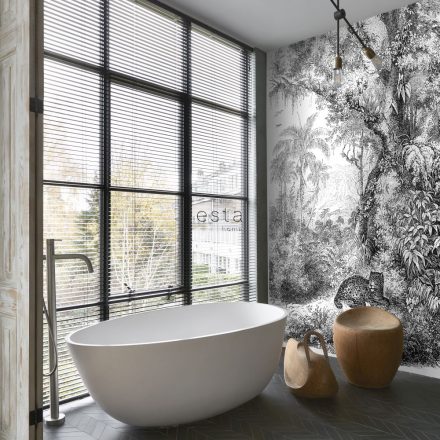 Modern fekete fehér grafika, melyen egy leopárd látható trópusi környezetben. A nemes vadállat méltóságteljes atmoszférát tükröz.