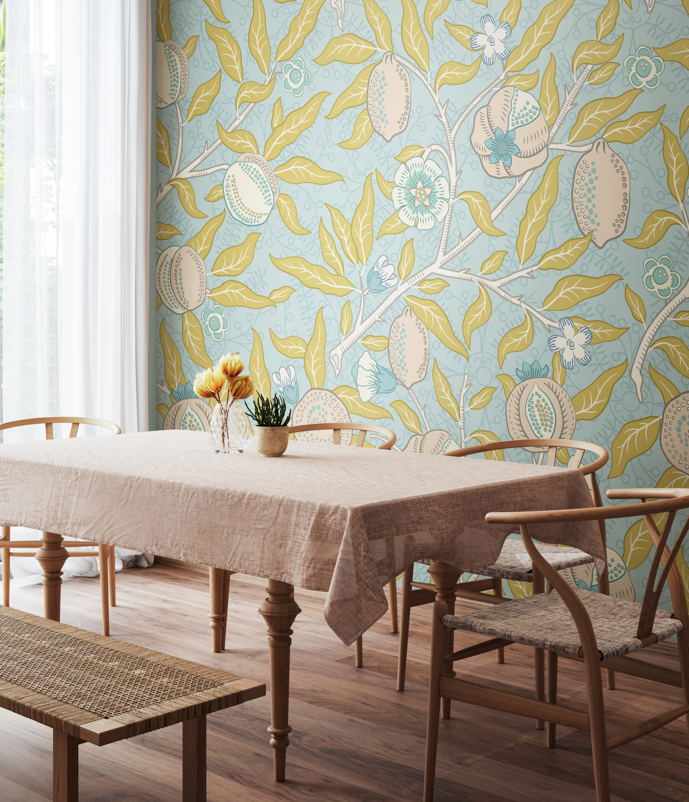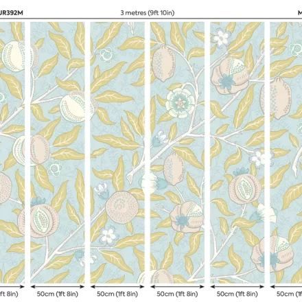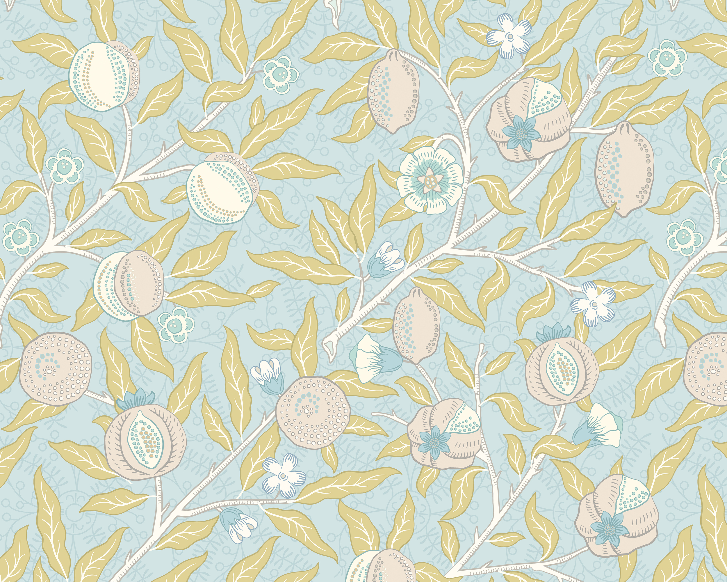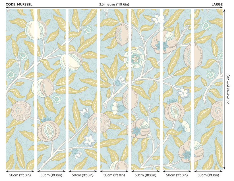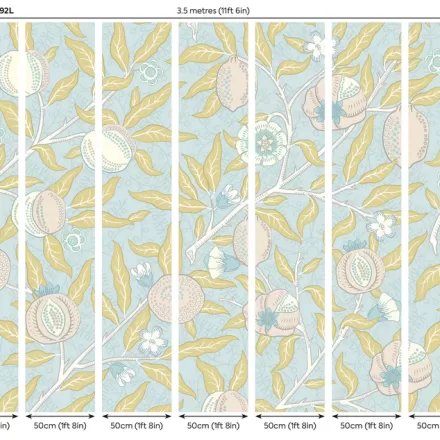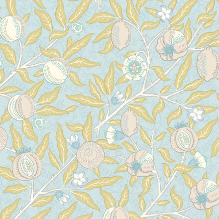 Kék botanikai mintás fotótapéta gránátalmákkal, melynek elegáns mintáját William Morris munkái inspirálták.