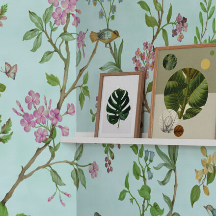 Gyönyörű chinoiserie fotótapéta türkízkék árnyalatban. A kecsesen kanyargó indamintát törékeny énekesmadarak teszik egyedivé és elbűvölővé.