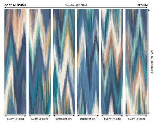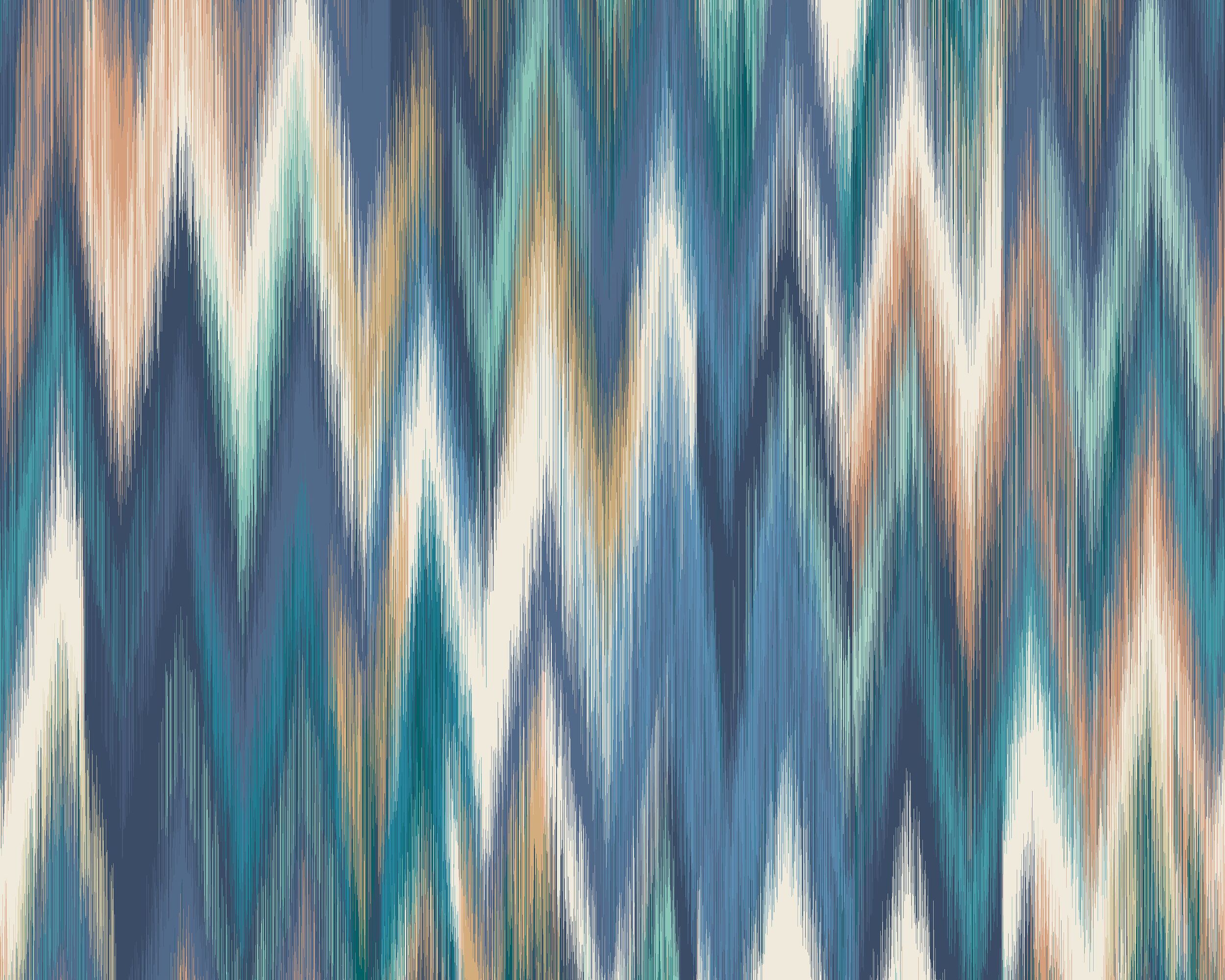 Kék fotótapéta ikat mintával, melynek látványos designja drámai hatást kelt. Az elmosódott színátmenetek és sokszínű vonalak lágyabbá teszik a geometrikus mintát azáltal, hogy a nyomtatott mintázat a sima felületen egy szövött textúra hatását keltik.