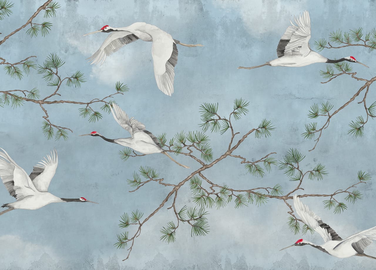 Kék orientális stílusú fotótapéta kecses darumadarakkal, mely légies eleganciával idézi meg a természet nyugalmát: szelíden szálló darvak tűnnek fel egy álomszerű, kék égbolt alatt, finoman kidolgozott fenyőágak ölelésében. A kékes égbolt és a lágy felhők bensőséges, megnyugtató hangulatot teremtenek, miközben a hófehér színekben pompázó darvak, valamint a zöldesbarna ágrészletek életre keltik a japán tájak varázsát.