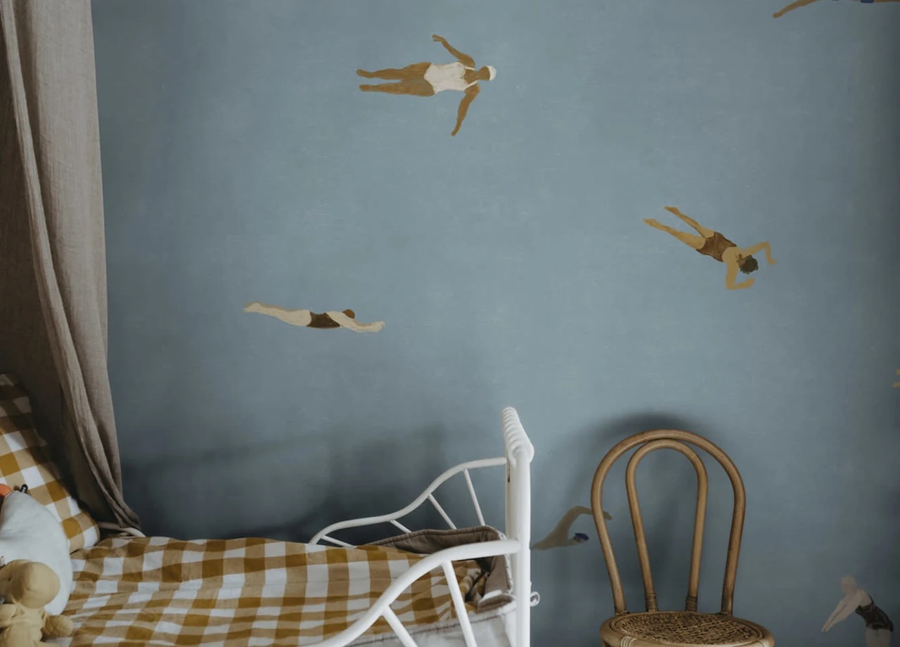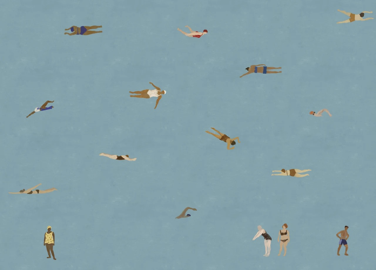 Kék Rebel Walls design fotótapéta, melyen a játékos és laza motívum kézzel rajzolt úszókat ábrázol, akik kecsesen siklanak a vízben – megragadva egy nyári nap önfeledtségét és szabadságát a medence partján. Minden részlet gondosan megalkotott, hűen tükrözve a Fine Little Day művészi elkötelezettségét és jellegzetes skandináv esztétikáját.