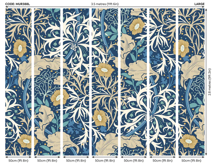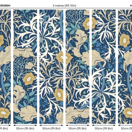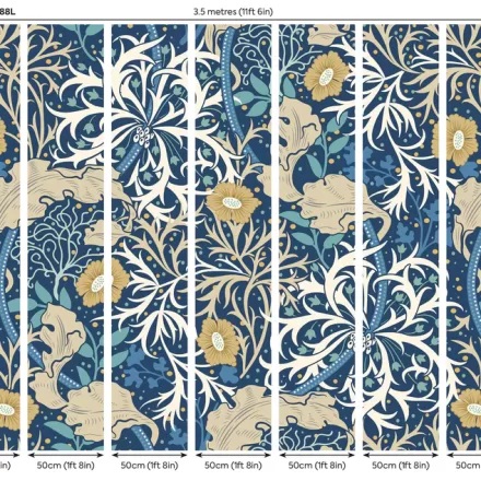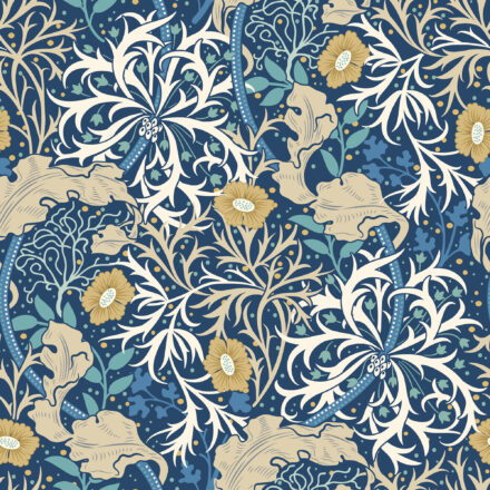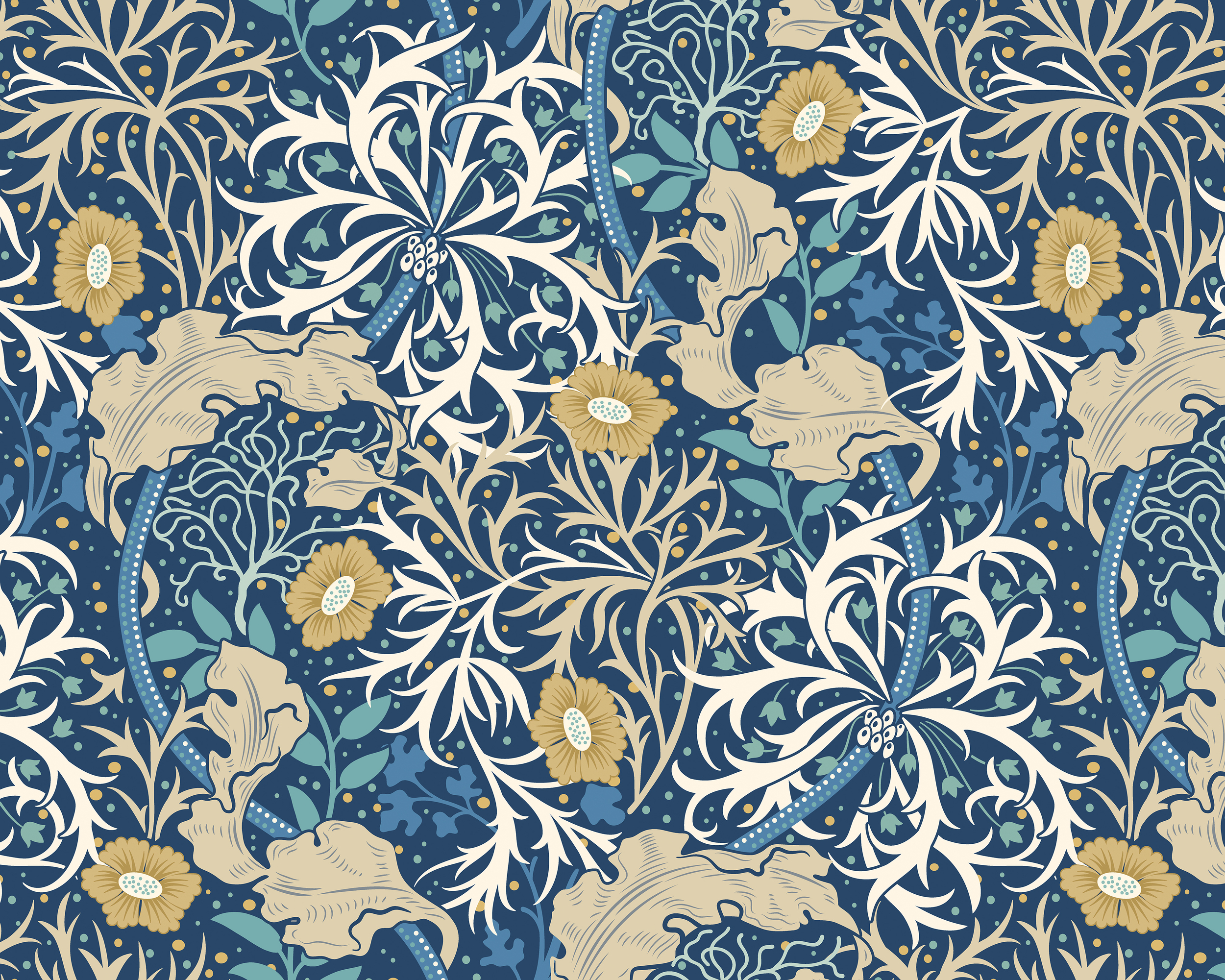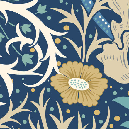 Kék virágos – indamintás fotótapéta, melynek kecses motívumát William Morris stílusa és híres mintái ihlették.