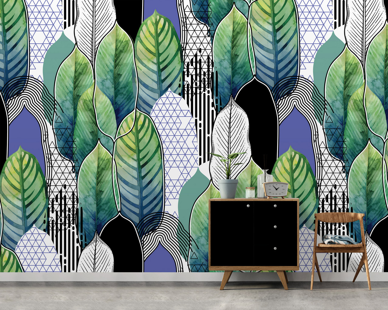 Különleges levélmintás fotótapéta, melyen a levélminta és a geometrikus elemek kombinálódnak.