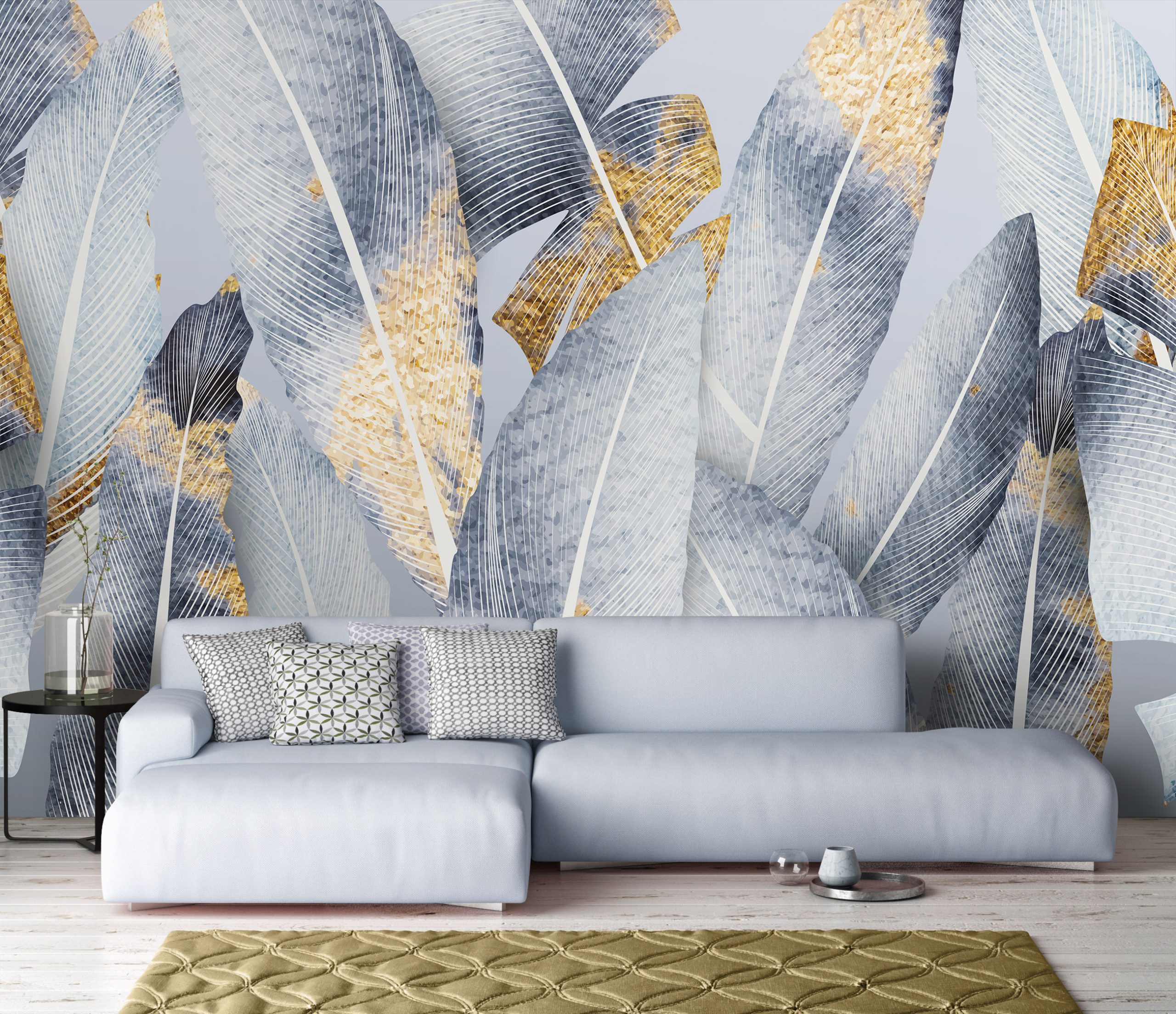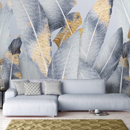 Glamúros hangulatú fotótapéta nagyméretű levélmintával, melynek kékes árnyalata eleganciát sugároz az enteriőrben.