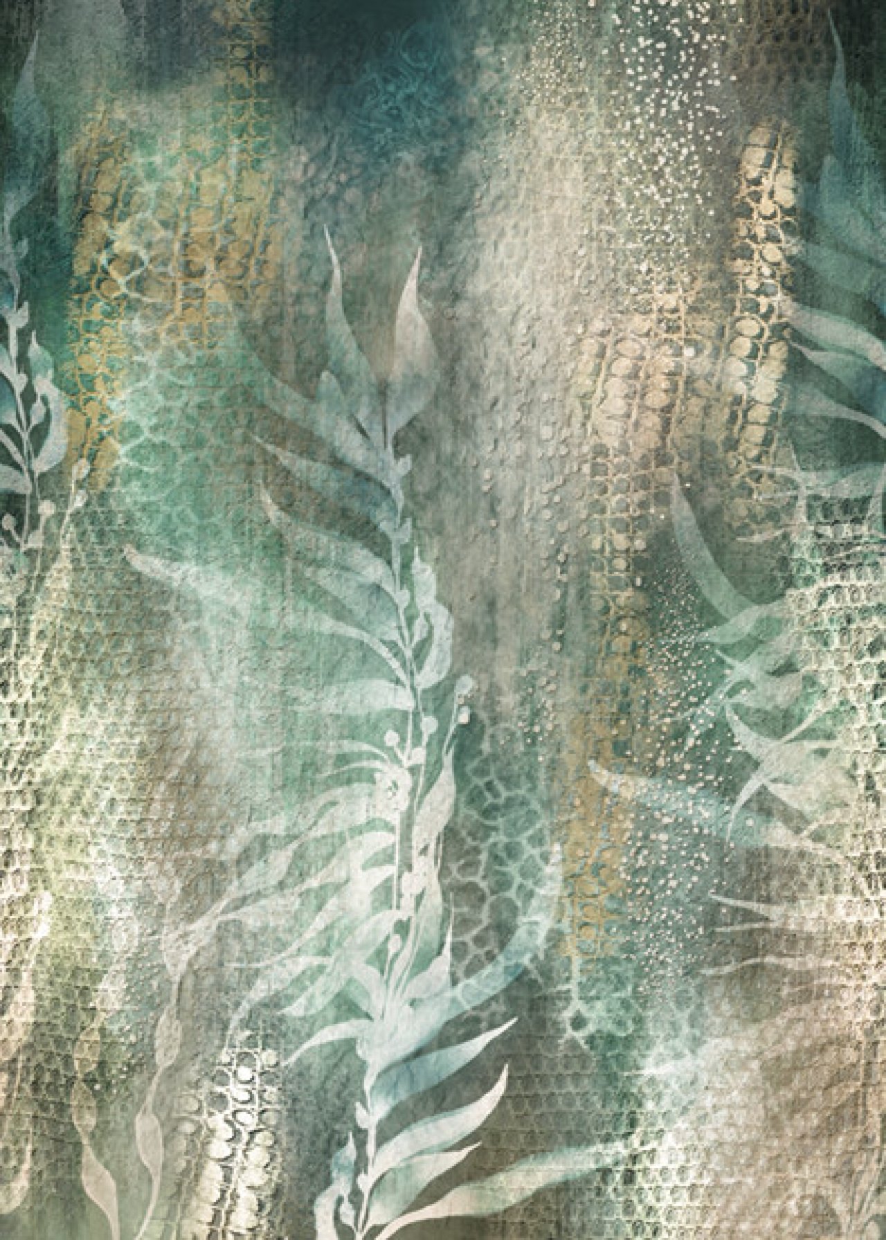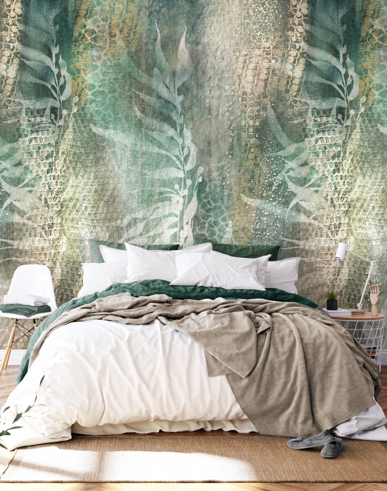 Kékes zöld design fotótapéta, melyen a levéllenyomat krokodilbőr imitáción jelenik meg. Izgalmas design fotótapéta, mely egyedi enteriőrt teremt.