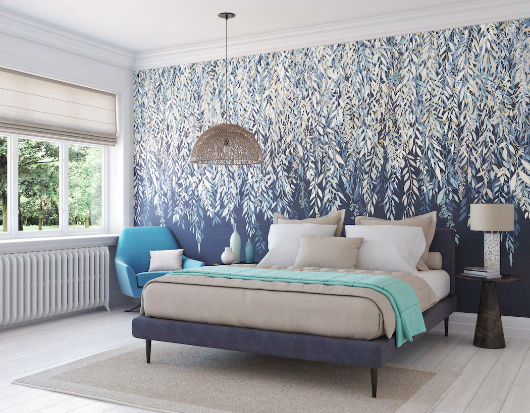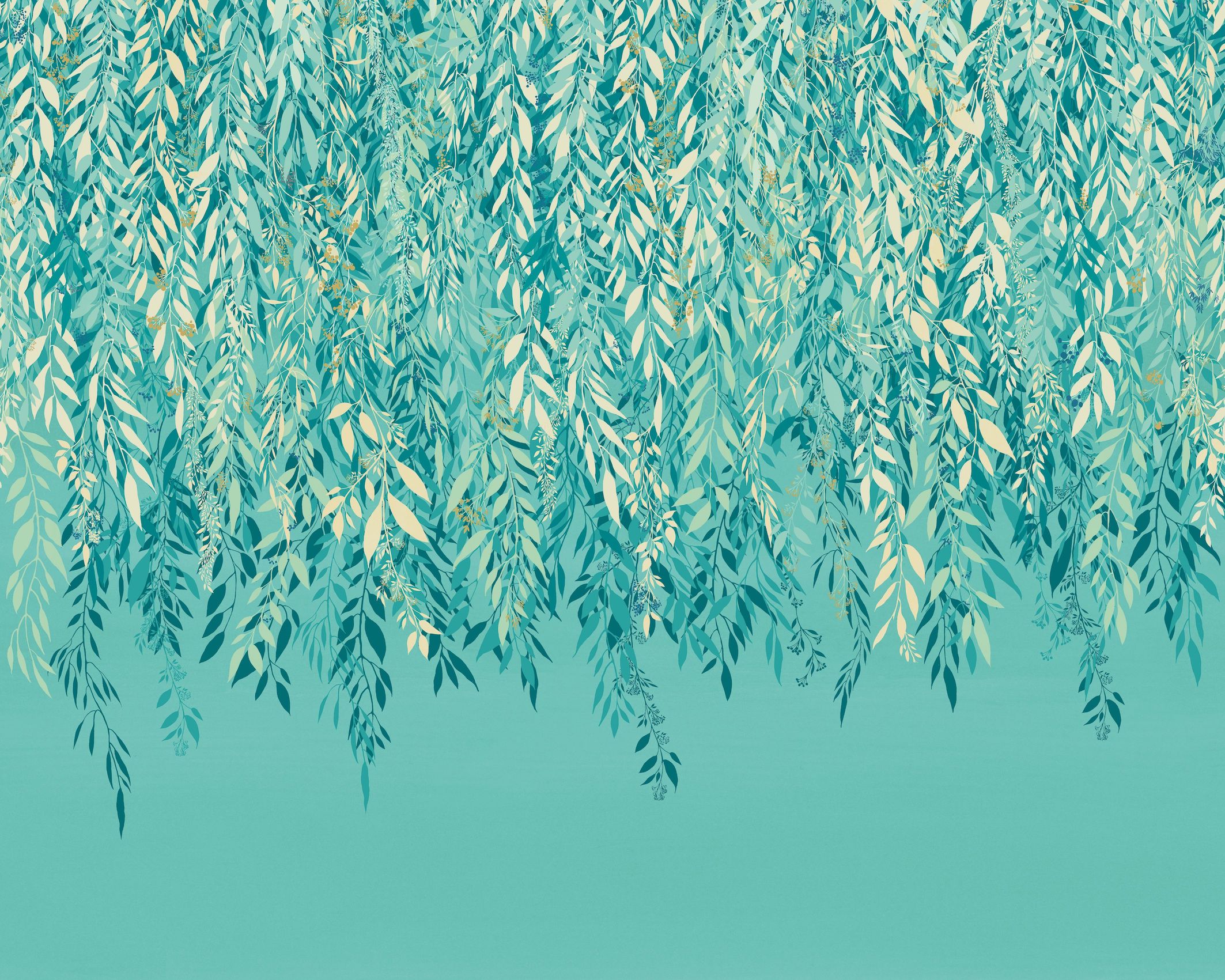 Lágyan leomló levélmintát ábrázoló fotótapéta, melynek kecses ágai több rétegben, egymásba fonódva hullanak lefelé a mennyezetről.