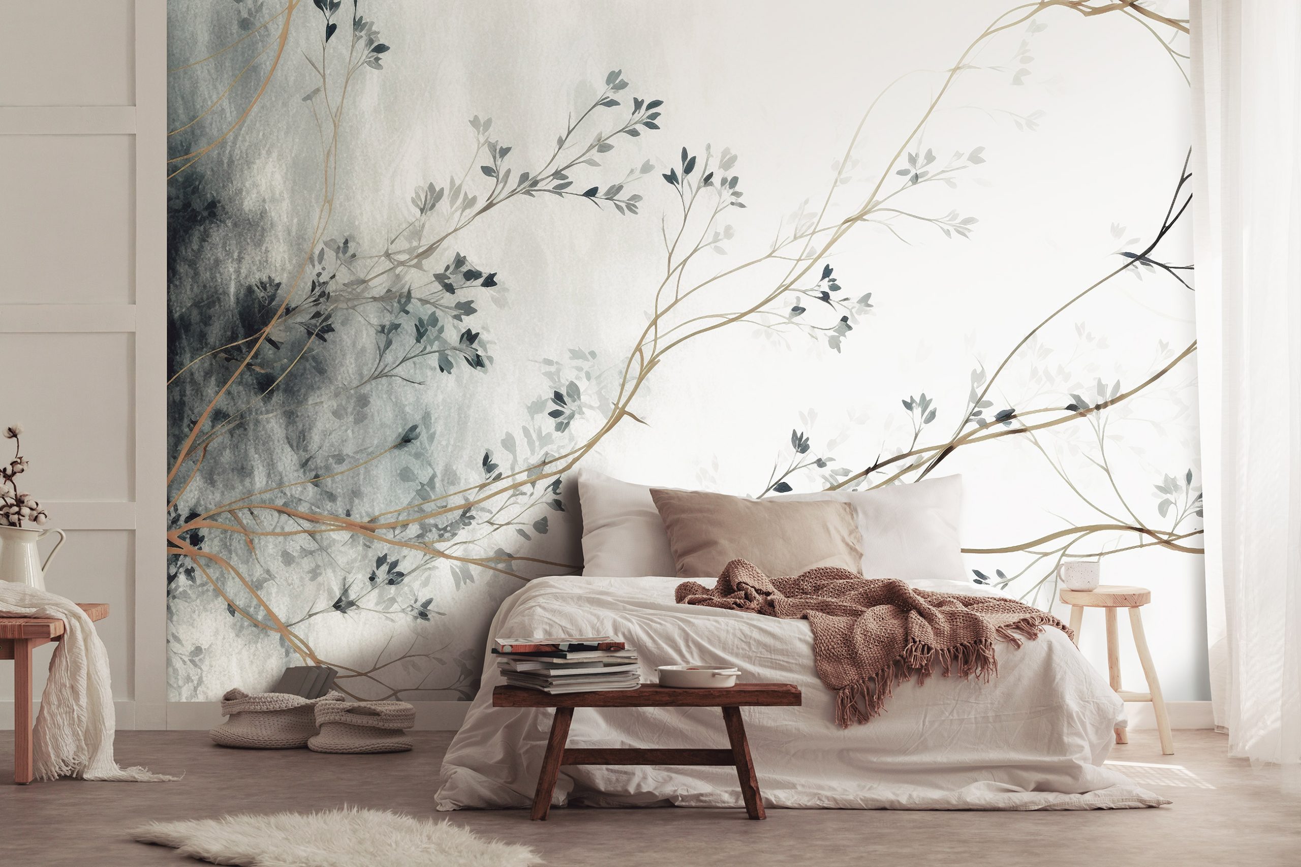 Könnyed faág mintás vlies fotótapéta, mely különleges atmoszférát teremt az enteriőrben.