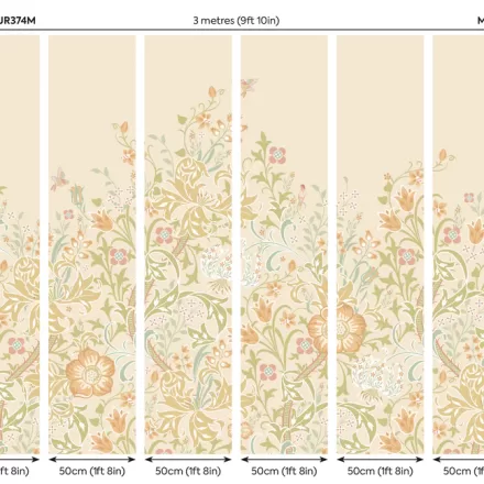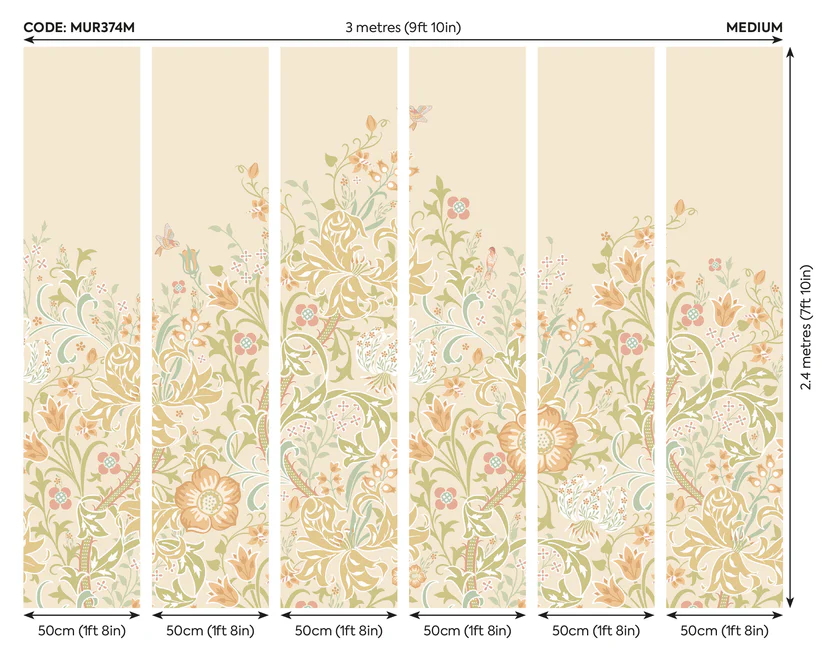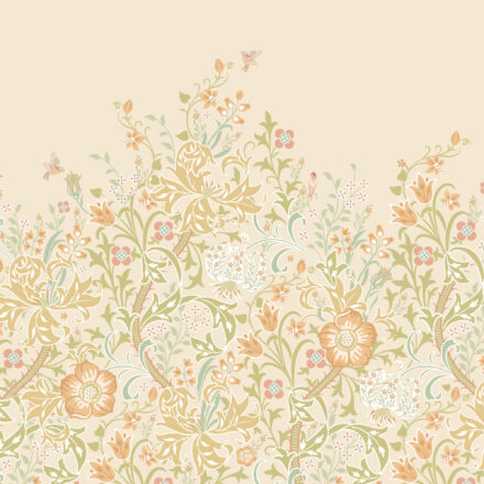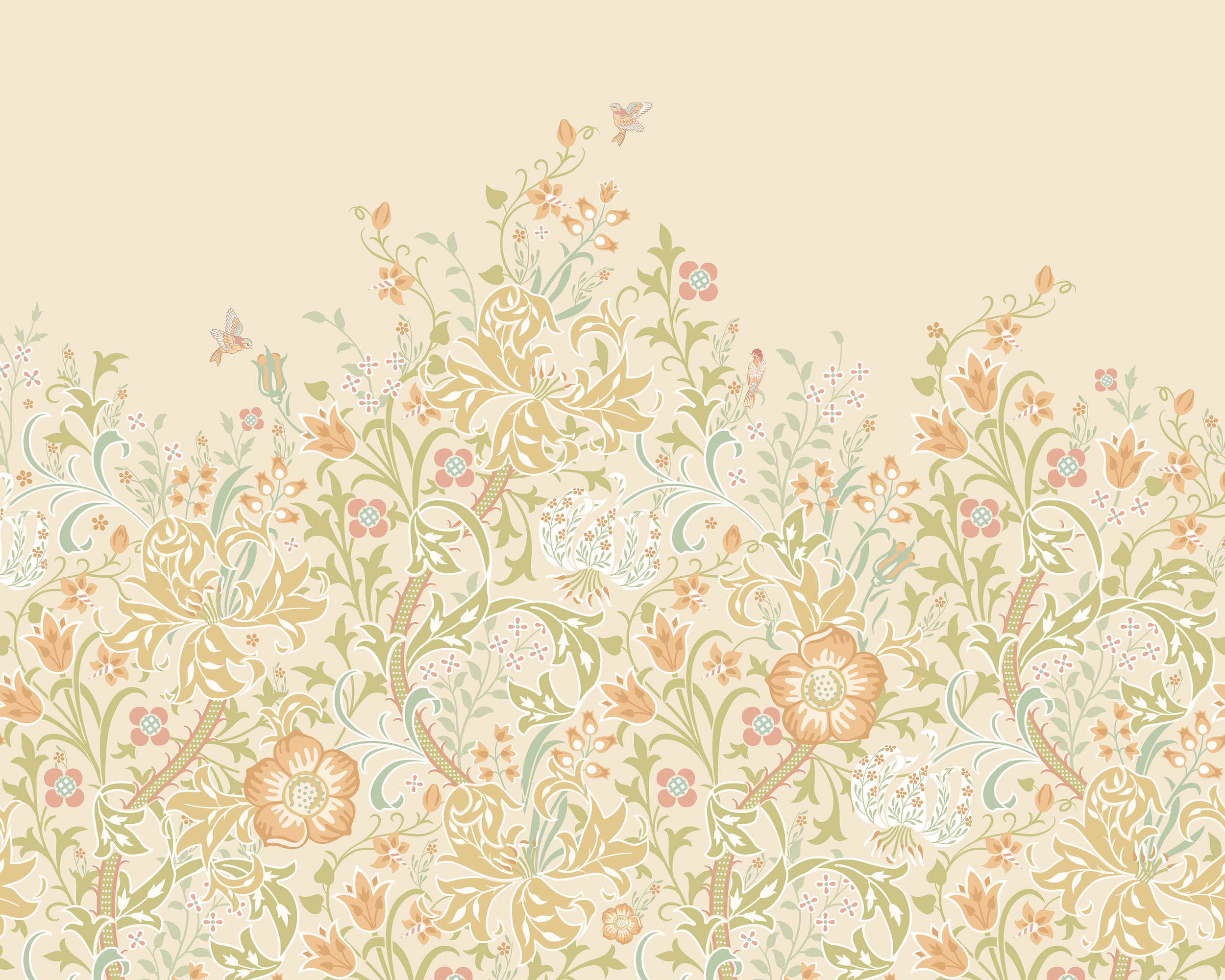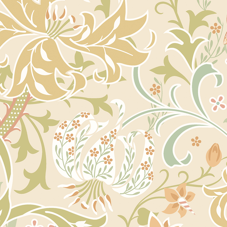 Krémes árnyalatú liliomvirágos fotótapéta klasszikus indamintával, melynek motívumát William Morris munkássága ihlette.