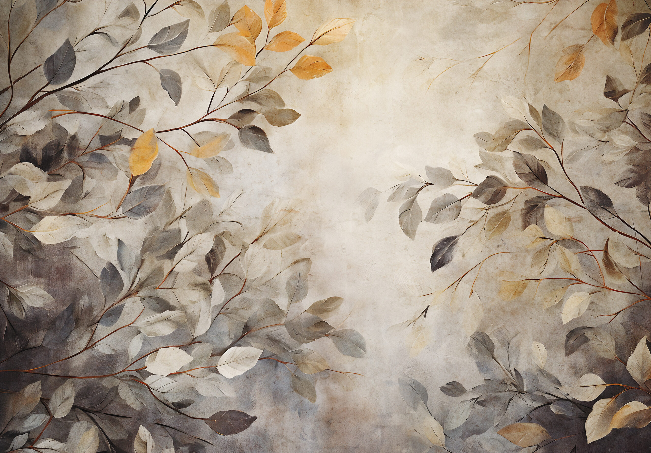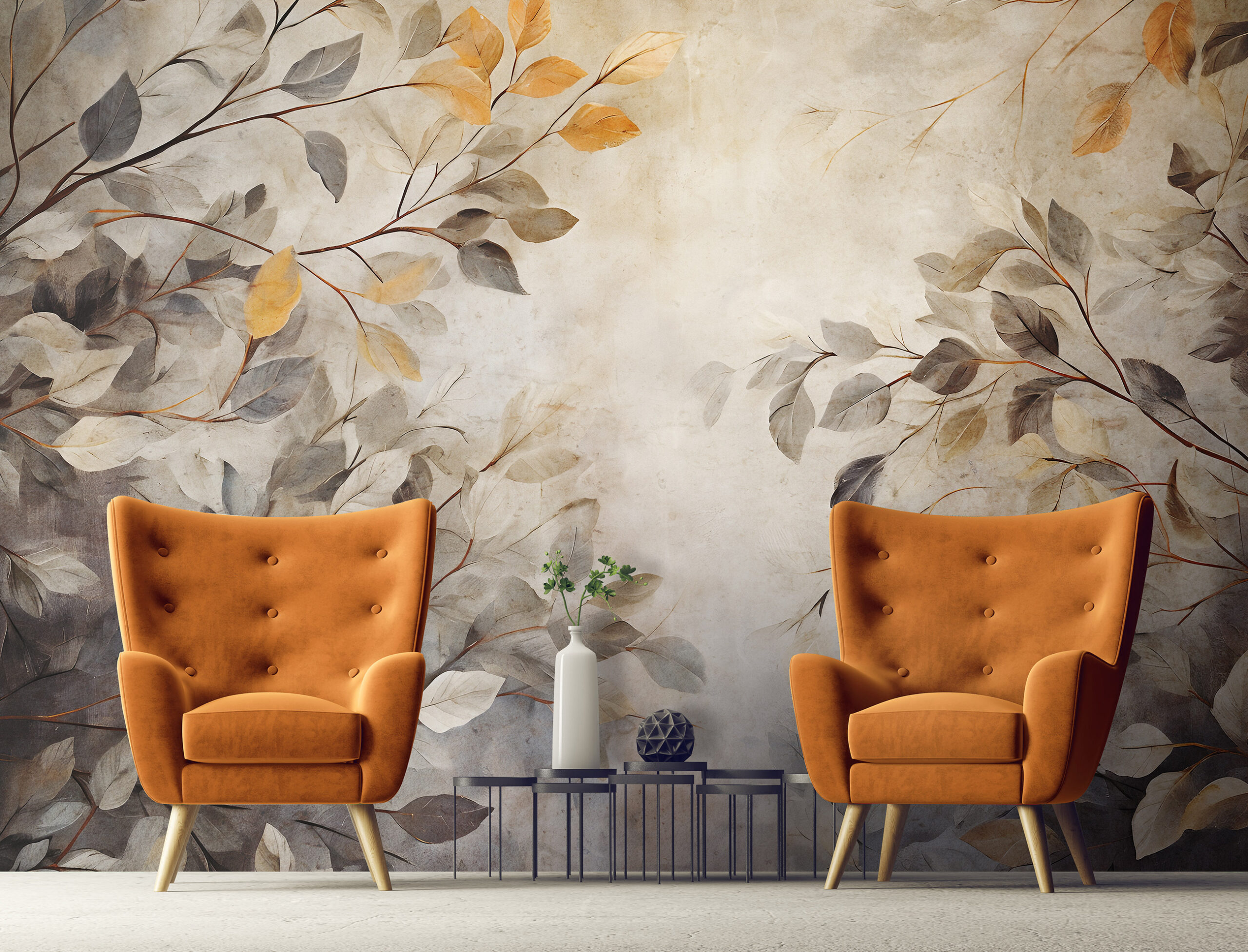 A természet harmonikus szépsége járja át az enteriőrt a fotótapétától, melynek könnyed levél mintája elegáns dekorációt teremt.