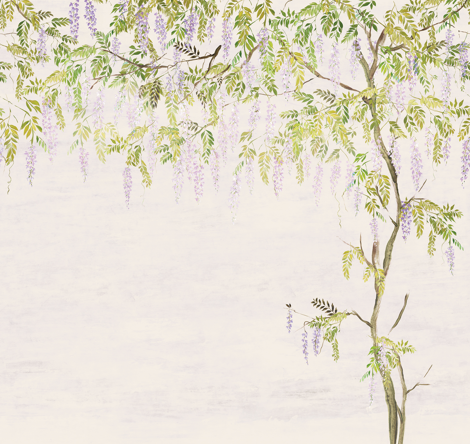 Akácfa virágos fotótapéta, melynek trendi mintáján a virágok kecsesen csüngnek lefelé a tapéta felső részéről. Lehajló virágai kellemes hátteret teremtenek egy kanapés nappaliban vagy a hálószoba ágy mögötti területén.