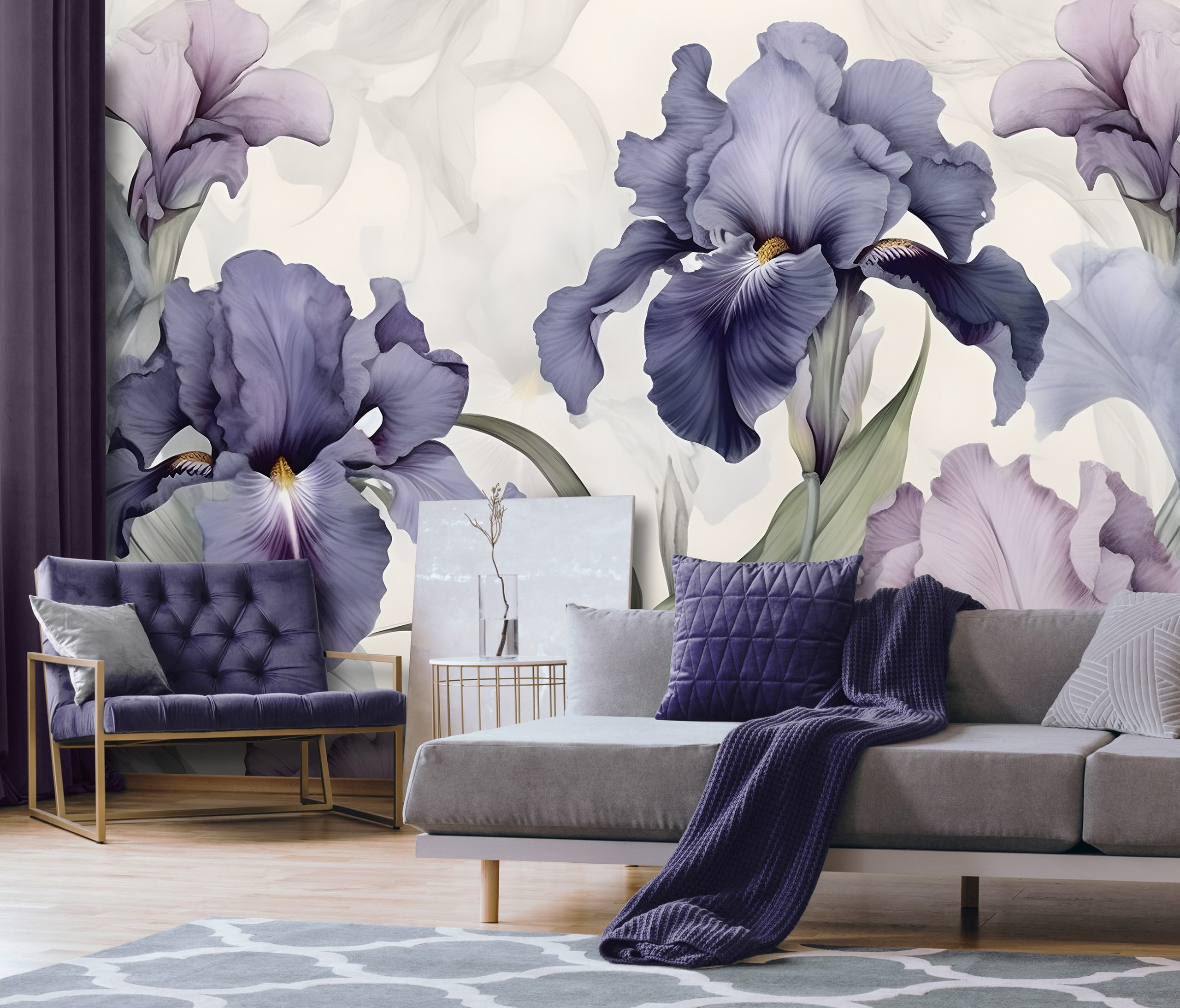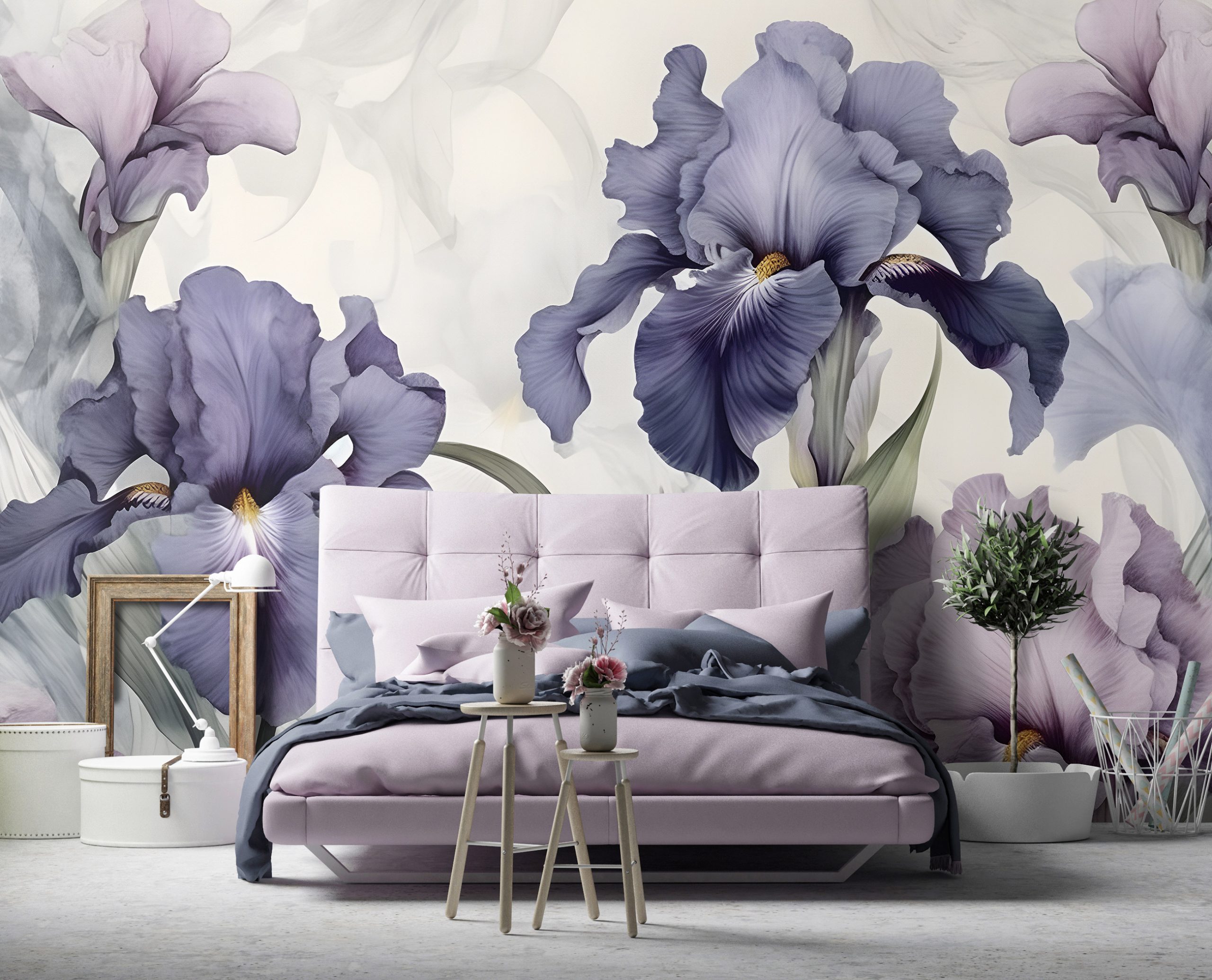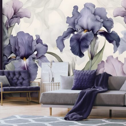 Különleges fotótapéta, melyen a nagy méretű lila íriszek festményként pompáznak. A tapéta kellemes árnyalata otthonos melegséget teremt, a virágok szépsége pedig nőies romantikát sugároz.