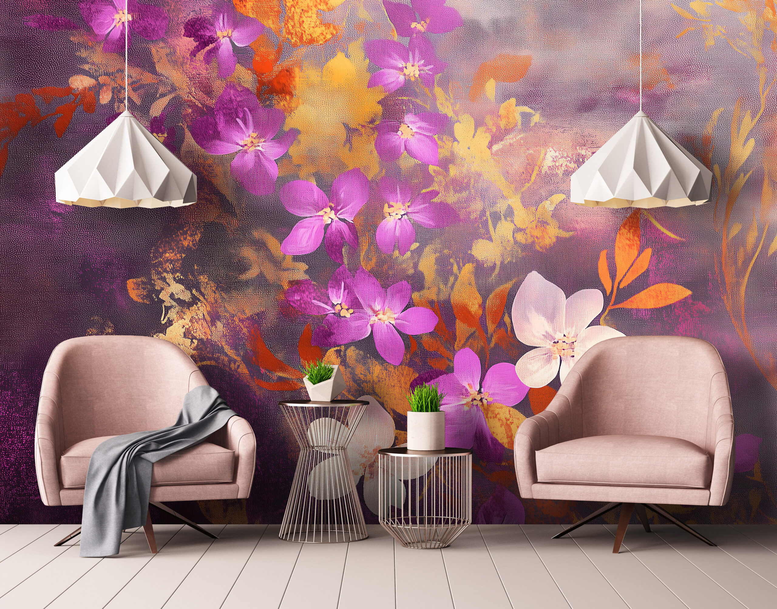 A lila és narancs árnyalatokban játszó virágmintás fotótapéta gazdag színeivel egyedi hangulatot teremt. A romantikus és vibráló kompozíció nappalikban és hálószobákban egyaránt különleges látványt biztosít.