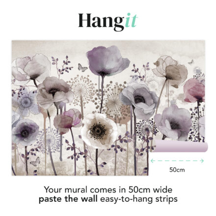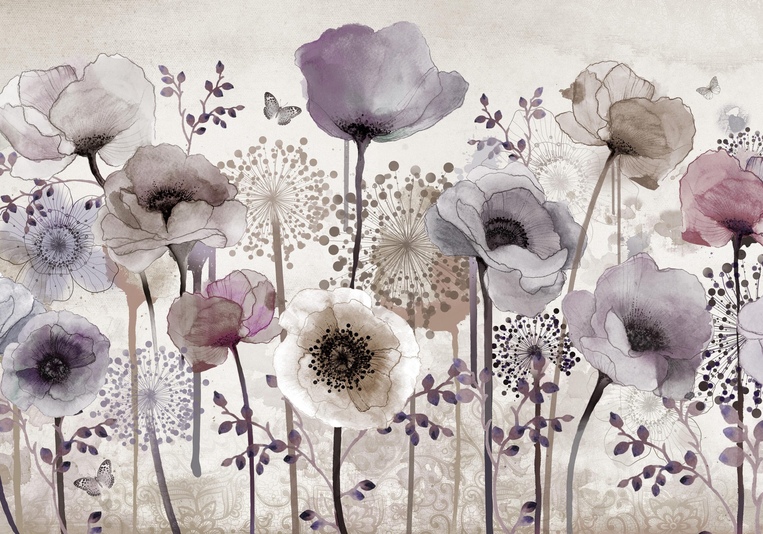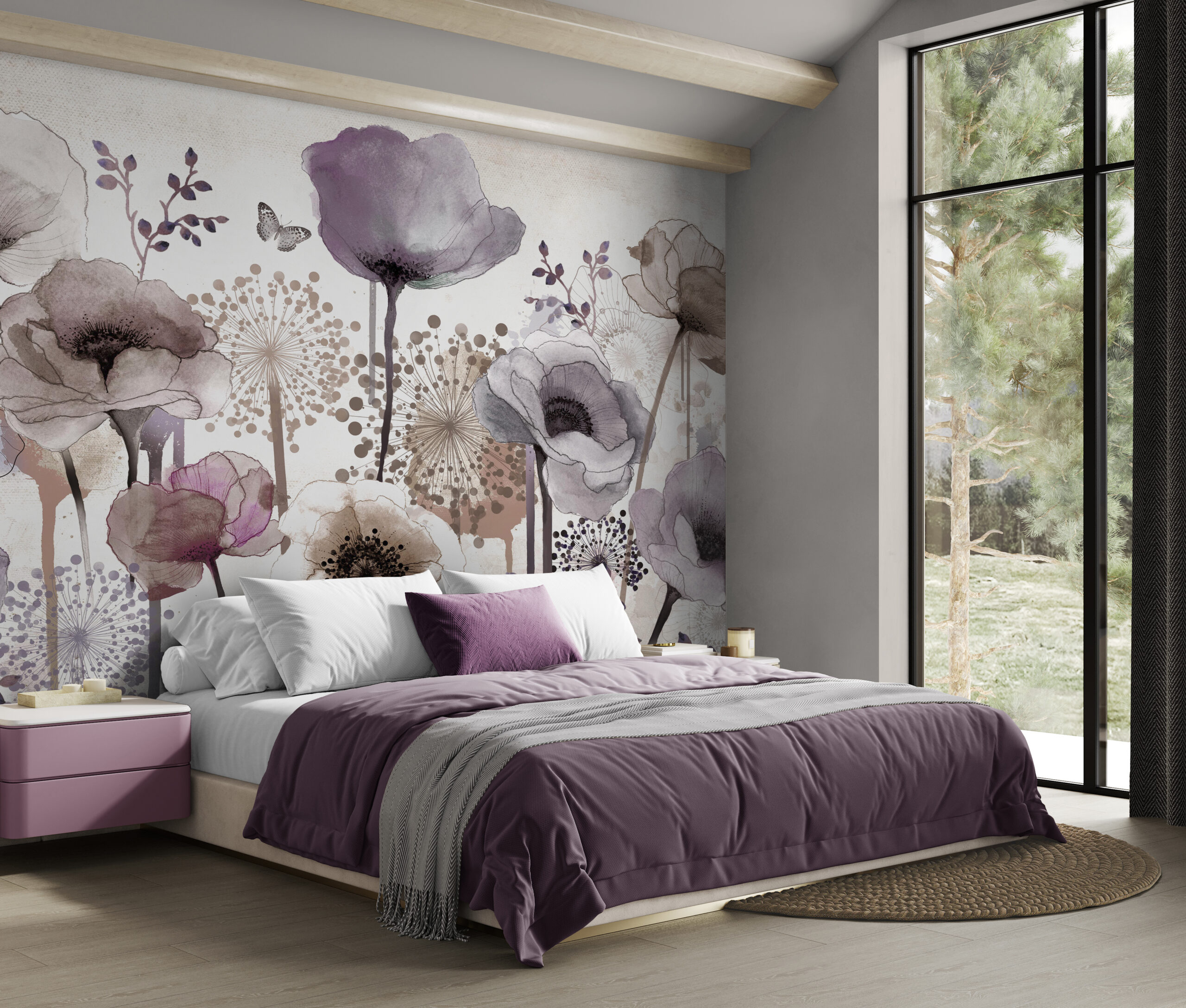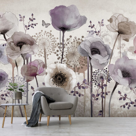 Lila pipacs virágos fotótapéta, melynek gyönyörű akvarell virágos mintája eleganciát és nőies szépséget varázsol otthonodba.
