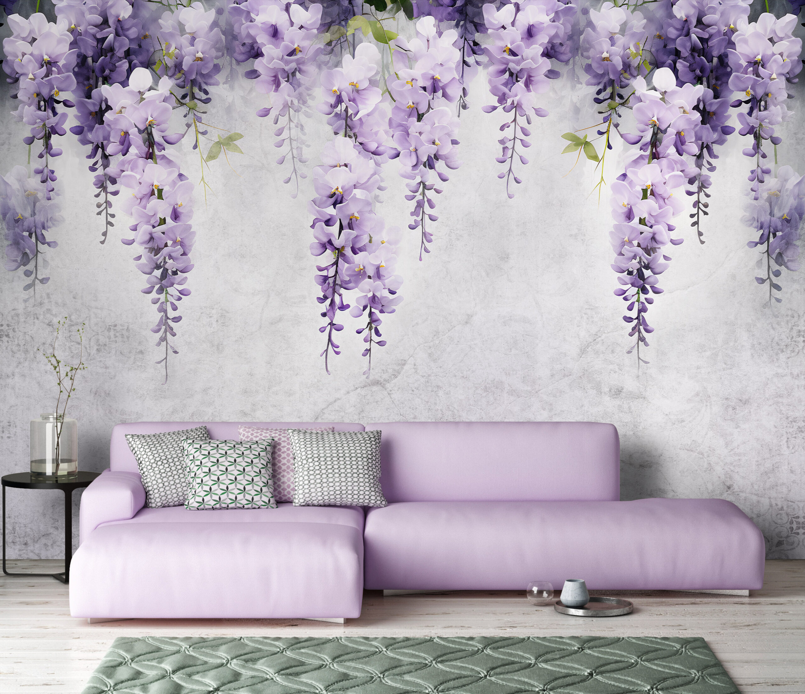 Romantikus hangulatú fotótapéta, melynek lecsüngő virágformája divatos fali dekorációt teremt hálószobában vagy nappaliban egyaránt.