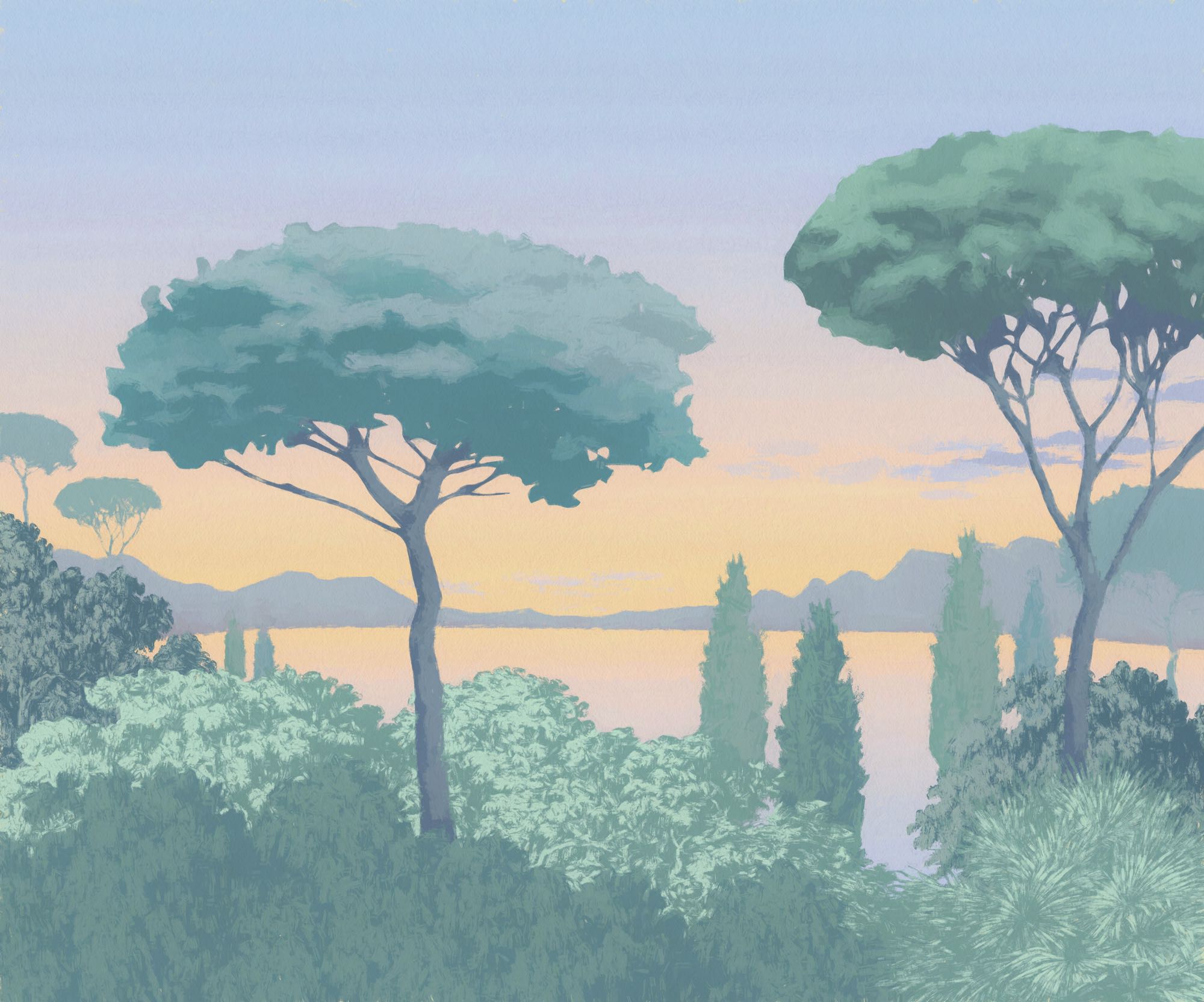Ez a fotótapéta egy nyugodt, mediterrán táj hangulatát hozza el az otthonodba: lágy dombok, karcsú ciprusok és jellegzetes fenyők rajzolódnak ki a finom kék és zöld árnyalatokban. A pasztelles színvilág könnyed, levegős érzetet ad a térnek, mintha a déli tengerpart esti fényeiben gyönyörködnénk.
