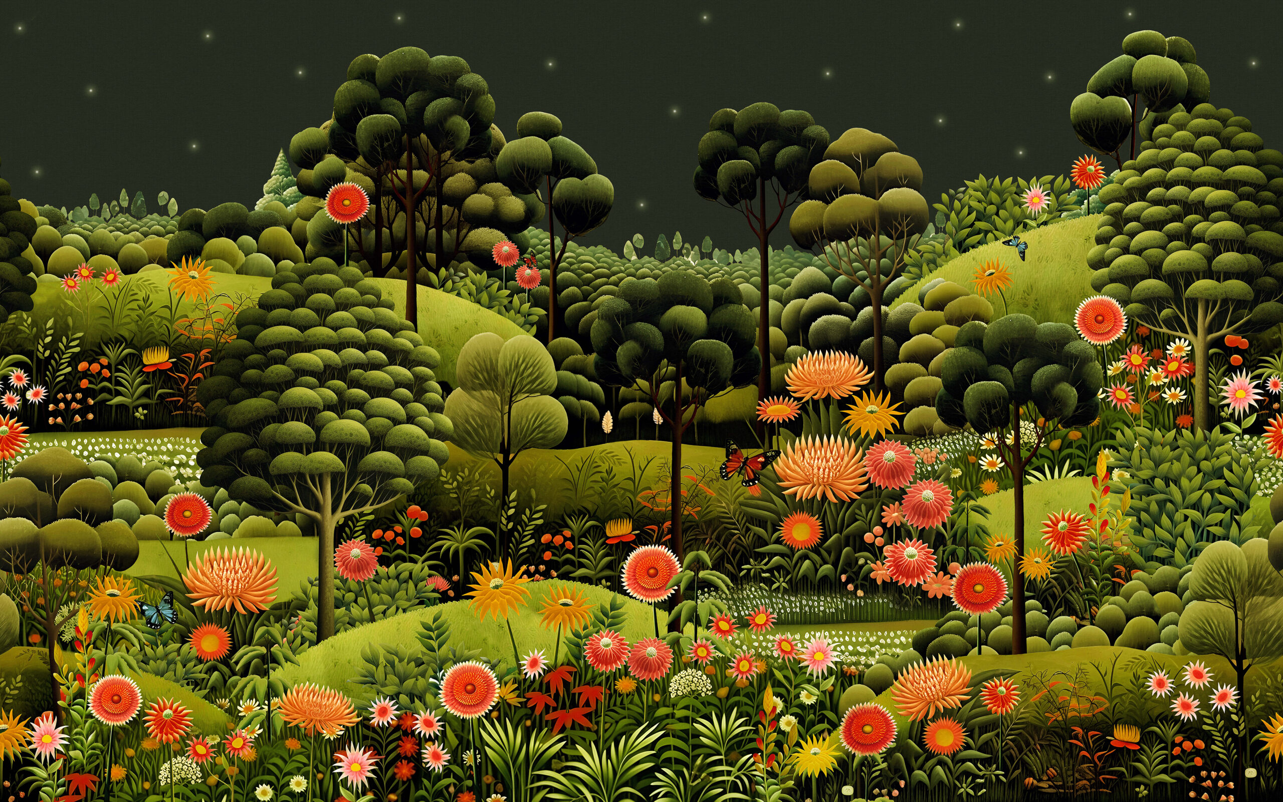 Mesés virágos mezőt ábrázoló fotótapéta sötét árnyalatban