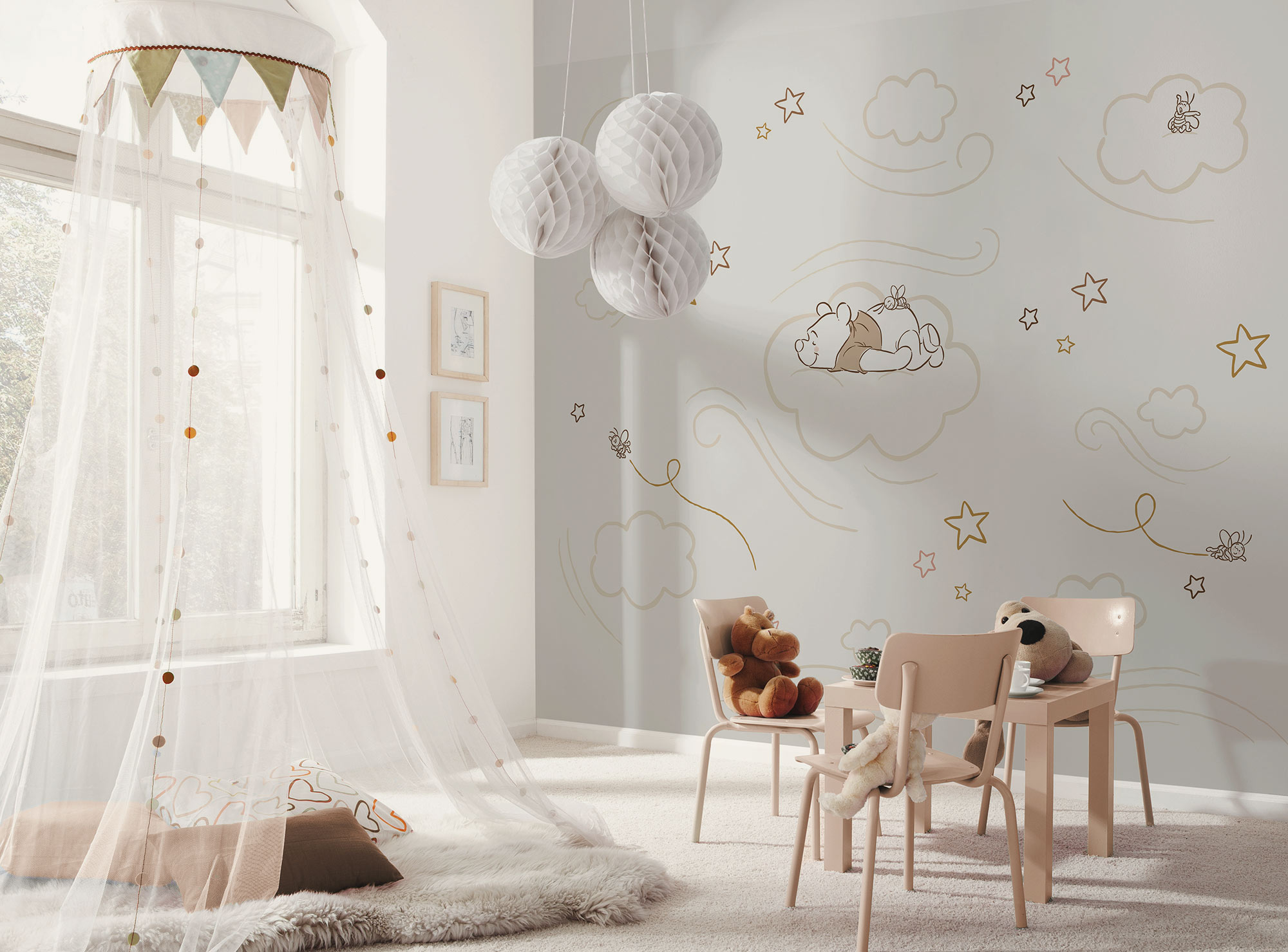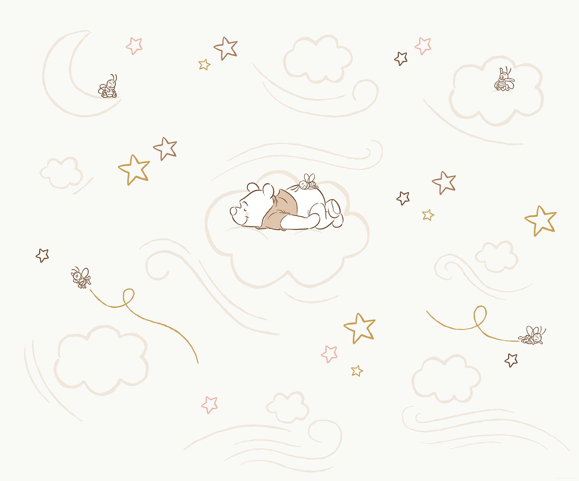 Micimackós fotótapéta – Álom a felhők között meghitt, megnyugtató hangulatot áraszt, ahogy Micimackó békésen szundikál egy puha felhőn, csillagok és holdak társaságában. A lágy vonalak és visszafogott színek igazi álomvilágot teremtenek a gyerekszobában – tökéletes választás pihenéshez, altatáshoz vagy egy nyugodt, mesés tér kialakításához.