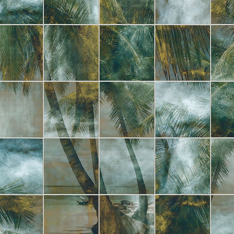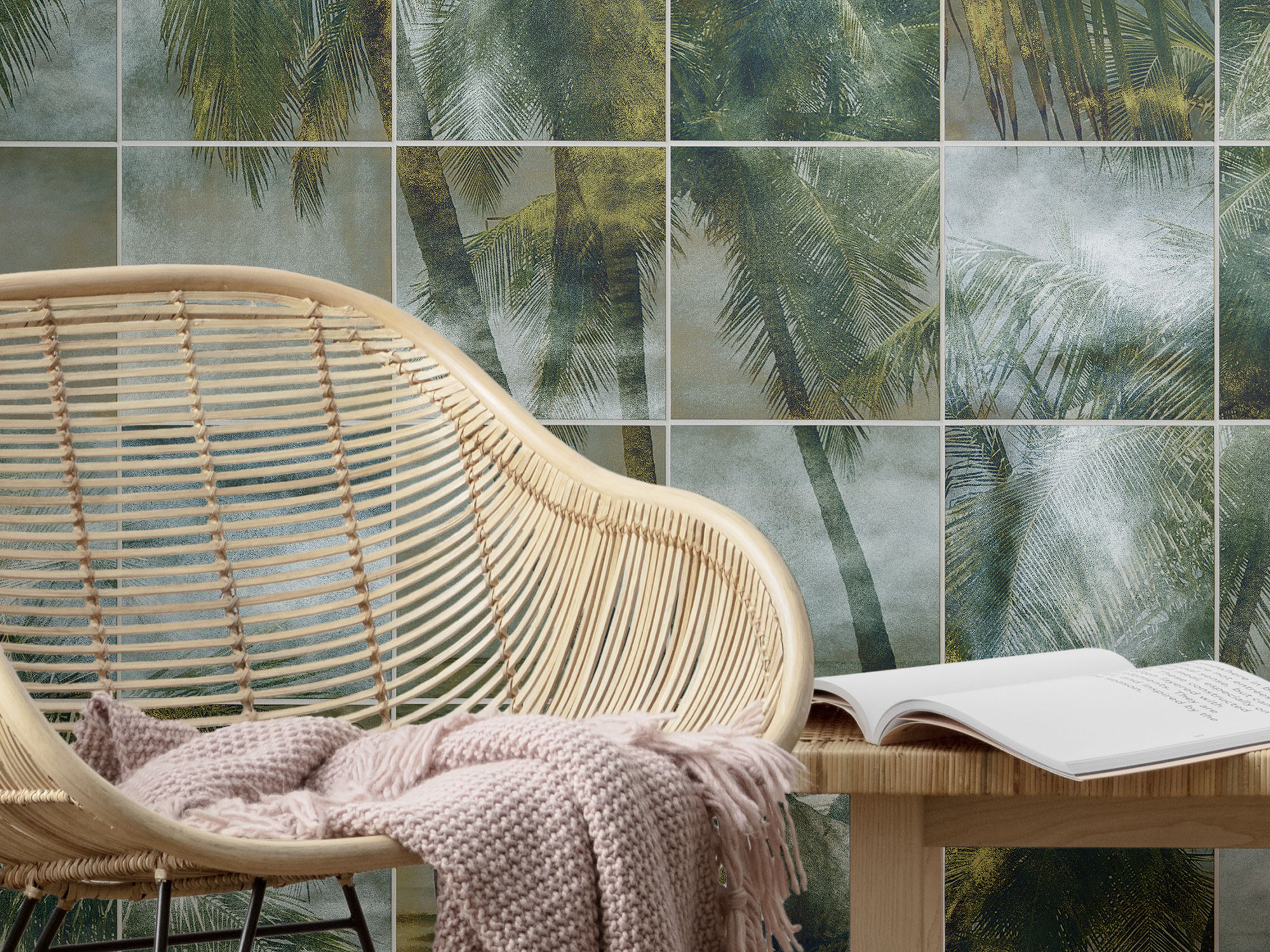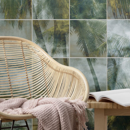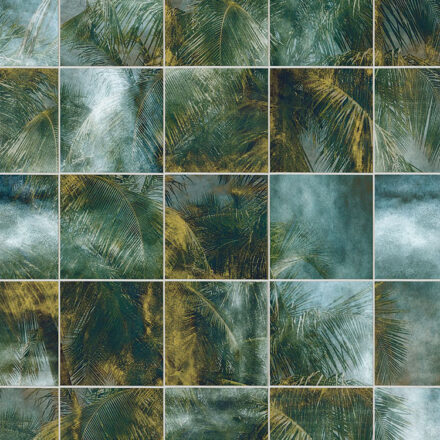 Modern fotótapéta dzsungel mintával, melynek különlegessége a puzzle jelleg adja. Trópusi pálmalevelek jelennek meg a fotótapétán, melyet négyzetes formában bont meg a geometriai minta.